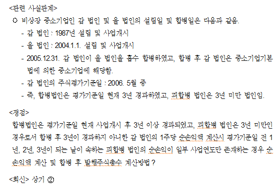 @폐업신고 후 3년여 만에 사업을 재개한 법인이 상증령 제54조 제4항 제2호에 규정된 “사업개시 후 3년 미만의 법인”에 해당하는지 여부는 사업재개 후 최초로 재화 또는 용역의 공급을 개시한 날을 기준으로 판단하는 것이다(서면4팀-3092, 2007.10.26).