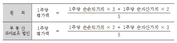 1주당 순손익가치와 1주당 순자산가치를 각각 3과 2의 비율로 가중 평균한 가액에 의한다. 다만, 부동산 과다보유법인(「소득세법 시행령」 제158조 제1항 제1호 가목에 해당하는 법인)의 경우에는 1주당 순손익가치와 순자산가치의 비율을 각각 2와 3으로 한다.