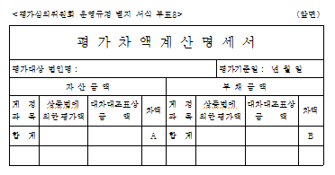 비상장법인의 대차대조표는 기업회계기준에 따라 작성되어 있으므로 대차대조표상 자산을 상증법의 규정에 따라 평가하여 그 차액을 가․감하여야 한다. 평가차액은 아래 양식으로 작성하는 것이 편리하다.