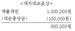 ➔장부상 매출채권 잔액은 900,000원이지만, 대손충당금은 단순히 장래의 회수불능을 예상하고 추정한 금액에 불과하므로 실제 대손금은 아니다. 따라서 매출채권에서 차감되지 않으므로 상증법상 평가액은 1,000,000원이 되는 것이며, 그 차액을 “차액”란에 기입한다.