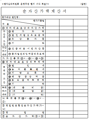 순자산가액은 아래의 순자산가액 계산서에 의하여 산정하는 것이 편리하다. 이하에서 본 계산서상 각 항목에 대하여 구체적으로 서술하기로 한다.