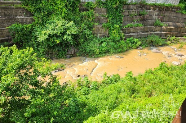 (사진촬영 : 글로벌뉴스통신 송영기 기자) 내려다 본 개울에 황톳물이 많이 불어 흘러가니 이색적이다