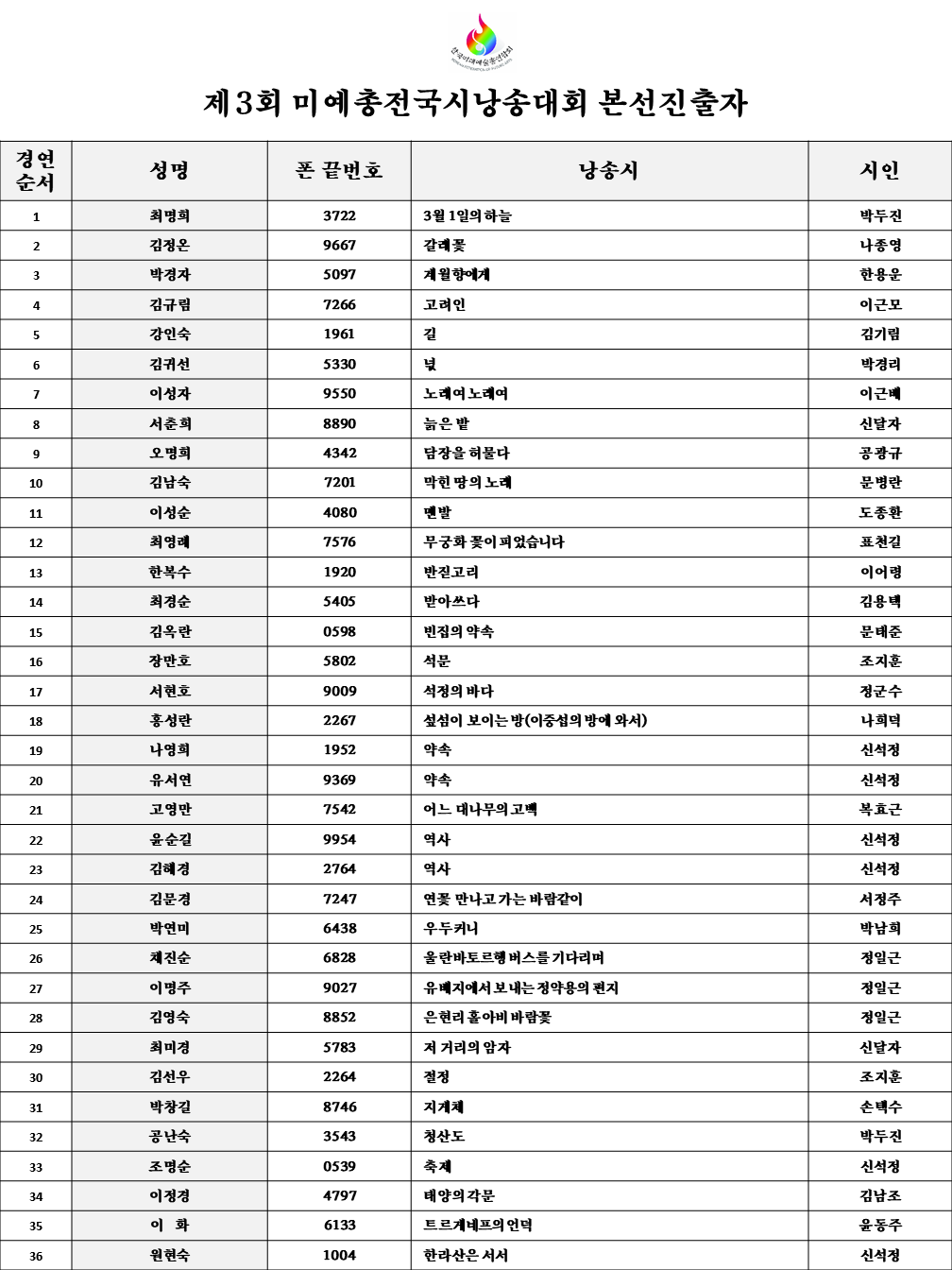 아쉽게도 이번 대회 본선에 진출하지 못하신 선생님들께는 위로의 말씀을 드립니다. 참고로 대회 경연 순서는 시 전문을 기준으로 가, 나, 다, 순으로 진행되며 본선에 진출하신 선생님들께서는(4월 22일 오후 2시) 당일 신분증 지참 경연시작 30분 전까지 대회 장소에 도착하셔서 참가 등록을 하시고 명찰을 교부 받으시기 바랍니다. 본선 진출자는 35명이었으나 동점자가 발생하여 1명이 추가되어 총 36명입니다.