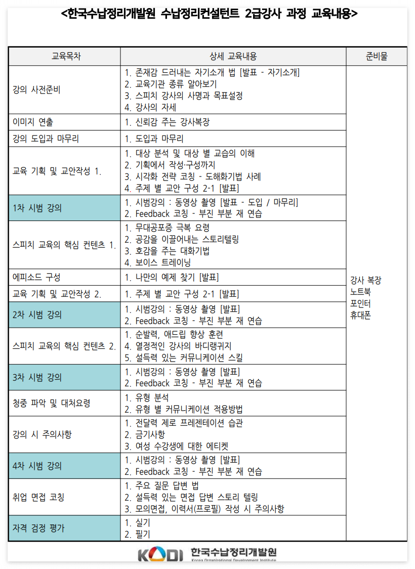 자격평가에 합격하면 '수납정리컨설턴트 2급강사'가 아닌 '스피치 2급강사' 자격이 주어집니다.
