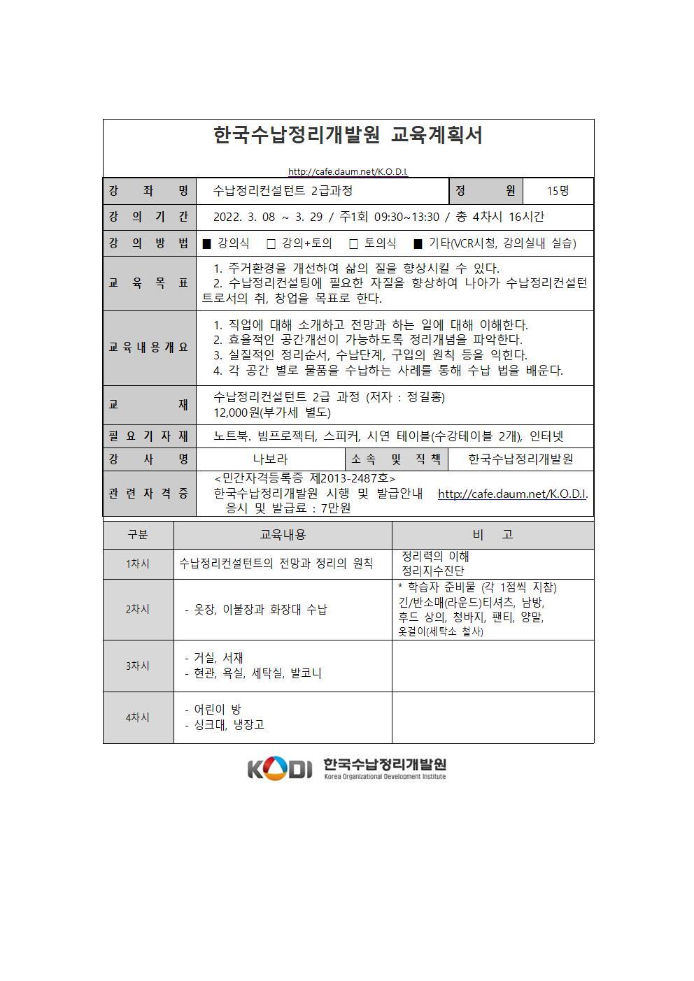 2) 수료 후 수납정리컨설턴트 2급 자격 취득검정에 응시할 수 있습니다.