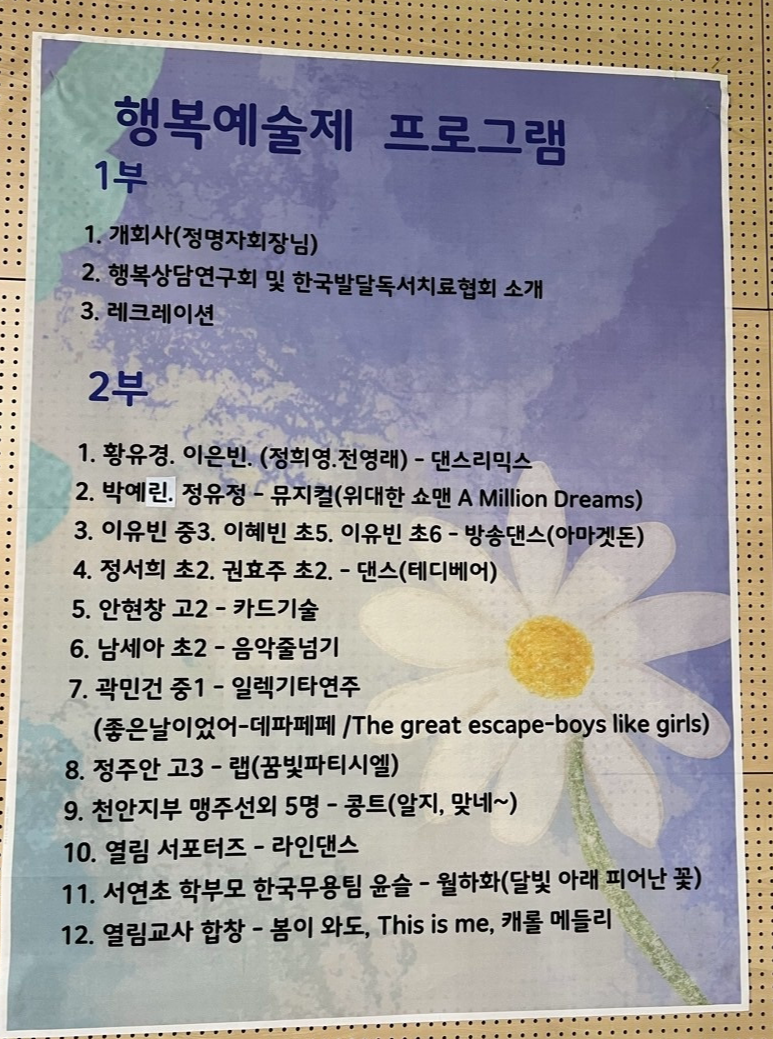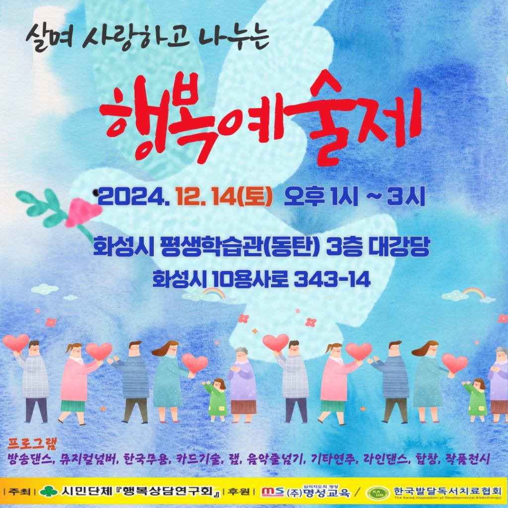 2024년 행복예술제는 행복해지고 싶은 사람, 행복을 돕는 사람들의 모임 교육시민단체 행복상담연구회가 주관하고, 한국발달독서치료협회와 (주)명성교육의 후원 아래 한해를 마무리하는 시기에 회원들과 가족들이 모여 마음과 사랑을 나누는 뜻깊은 행사였습니다.