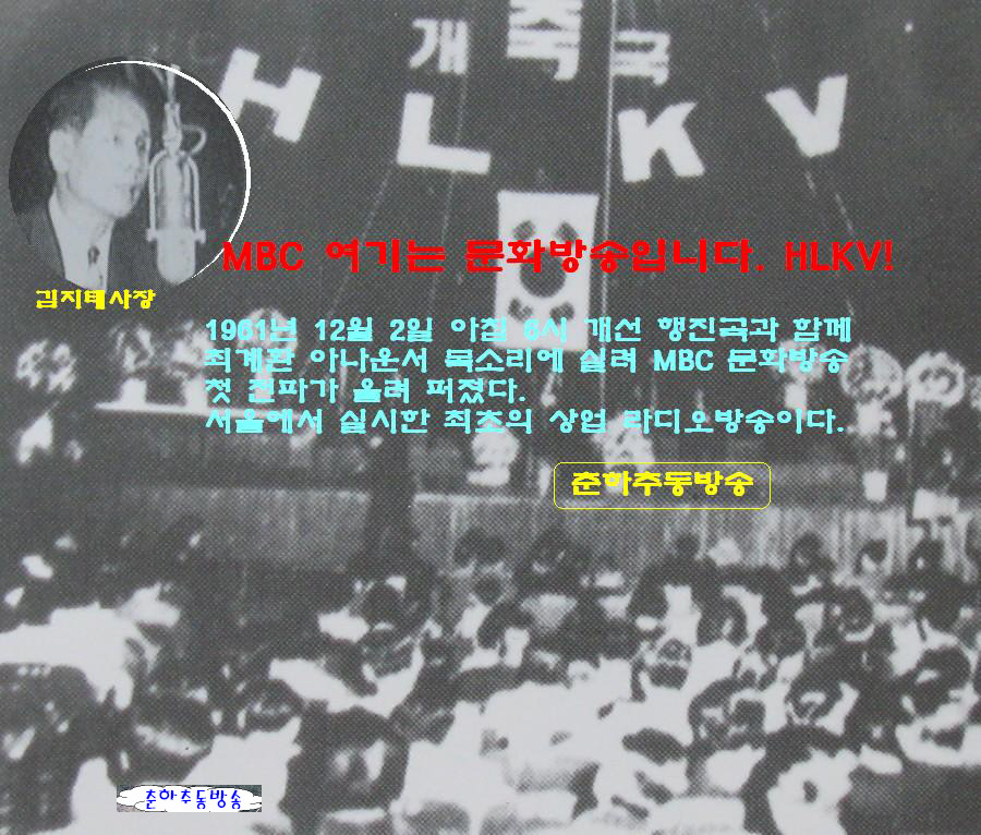 MBC 여기는 문화 방송 입니다! HLKV, 부산 mbc에 이어 서울 MBC가 감격의 첫 방송을 내보내던 날이었습니다, 서울특별시 종로구 인사동 15번지 동일빌딩에 자리 잡은 문화빙송은 이날부터 날마다 13시간씩 상업 광고주가 제공하는 프로그램을 중심으로 방송하면서 “국민의 생산의욕을 촉진하고 산업경제의 번영에 기여 할 것 ”을 다짐했 습니다. 출력 10Kw, 900Khz로 개국한 서울문화방송은 먼저 개국한 부산문화방송과 네트워크를 형성하고 본격적인 상업방송시대를 열었습니다.
