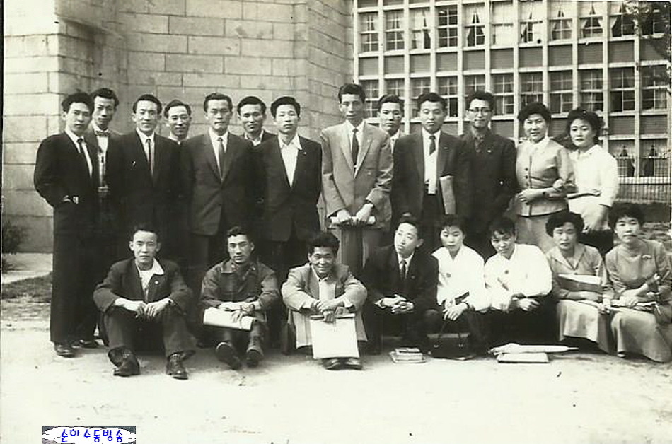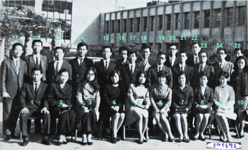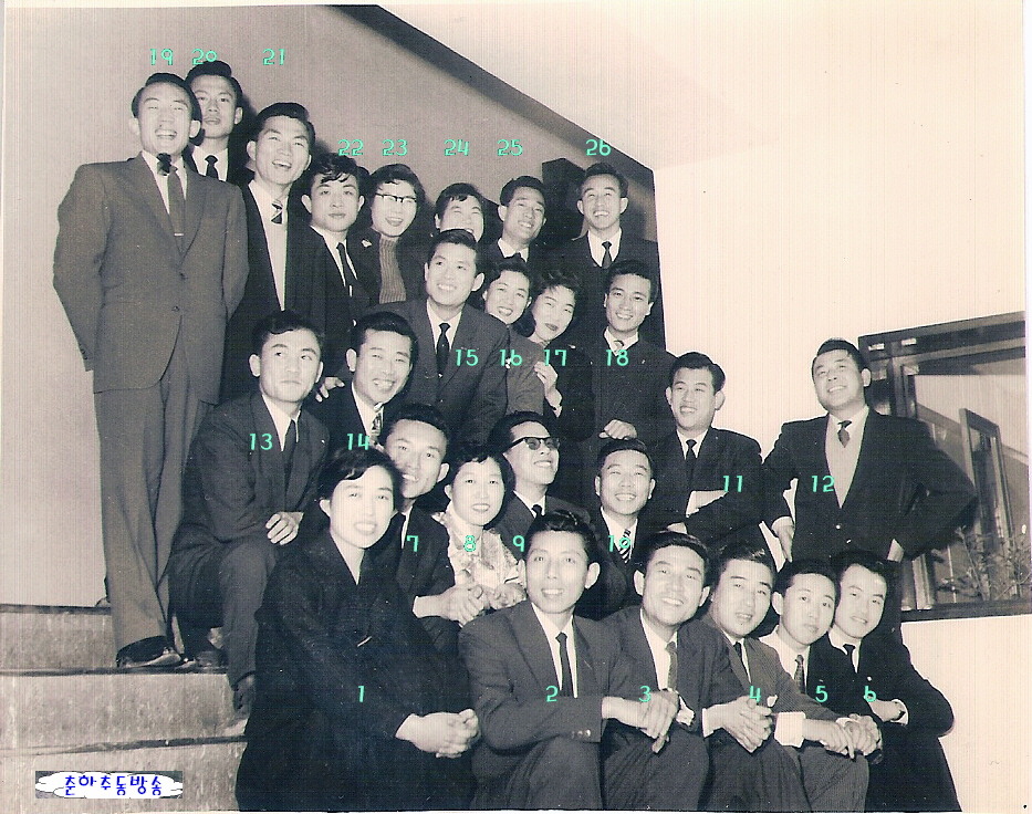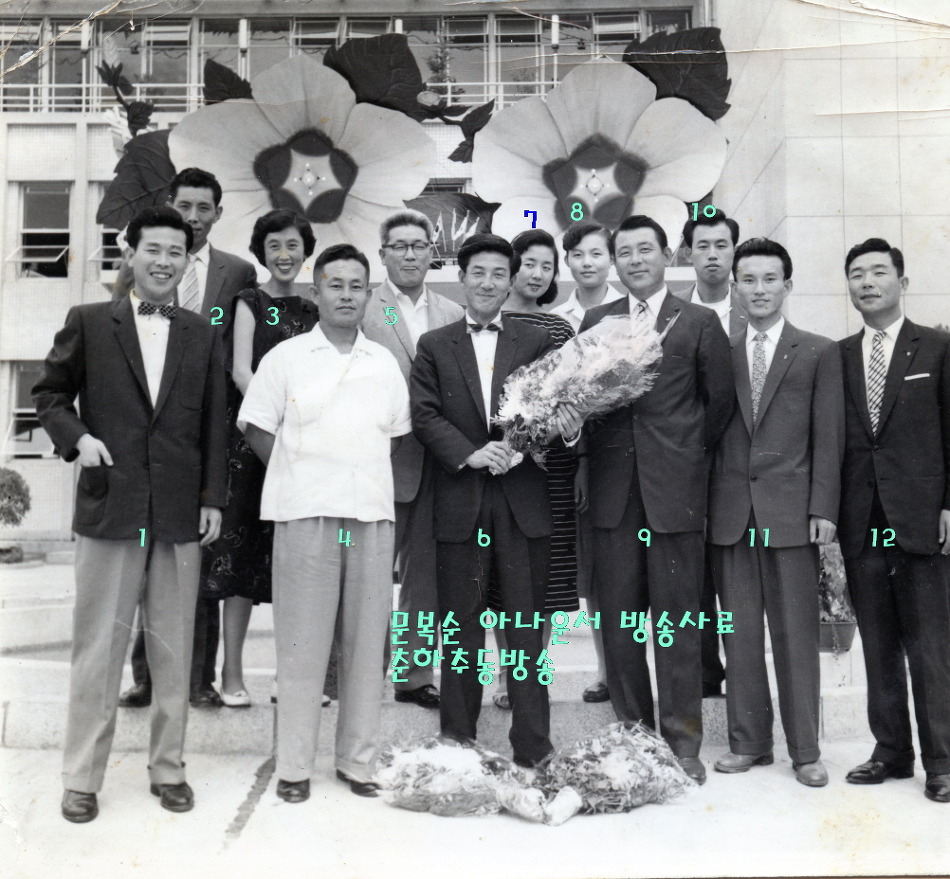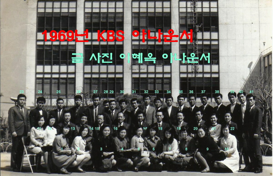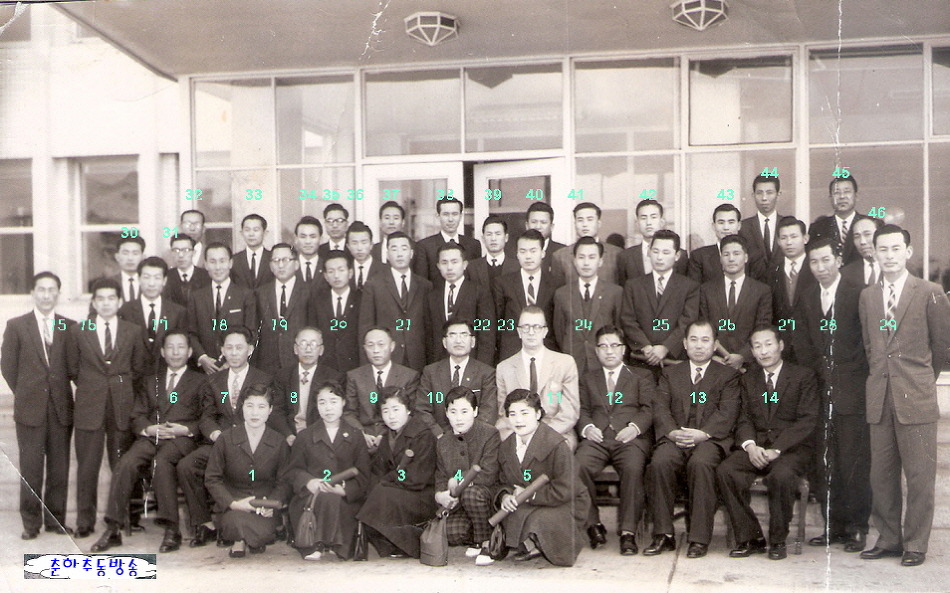1959년 아나운서 신입사원 강습회를 마치고 촬영한 사진입니다. 7.이종훈(기술과장), 8.이운용(중앙방송국장), 9.이규일(방송관리국장), 10.전성천(공보실장), 11.거스(미국인 방송고문관), 16.배준호, 17.김규, 18.서병돈, 19.김순환, 21.이병열, 22. 24.박진현, 25.허환, 26.김인권, 27.조병해, 29.노정팔, 34.김영길, 36.오남열, 38.최규락, 39.박노설, 40.김주환, 41.홍종선, 43.송한규, 44.강익수, 45.강찬선, 이때 김정현, 김경숙, 김현수, 서선경, 이연영 등5 분의 여성 아나운서가 입사했는데 1. 2. 3. 4. 5번이 화인되는데로 기록 하도록 하겠습니다