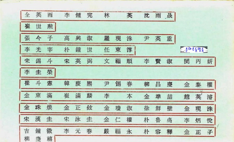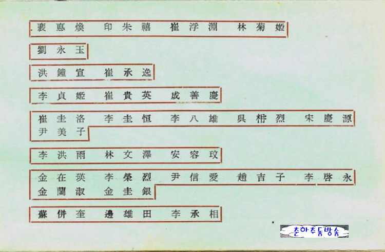 송애경, 천명옥, 김인숙, 성경희, 최소희, 유숙희, 유혜선, 최승희, 김무중, 박기만, 정도영, 김원태, 김성응, 김영진, 이계진, 최관숙, 유혜선, 남궁문옥, 우종란, 이영숙, 강혜정, 김광희, 백영수, 정강은, 임혜경, 최성란, 서영숙, 범효춘, 이신웅, 강동순, 김수홍, 박영웅, 김혜자, 유숙경, 강성희, 이강인, 정혜경, 유희순, 진정자, 석화현, 박애림, 윤혜원, 박경희, 박인숙, 백정란, 장주호, 고성균, 이명용, 황 량, 김영임, 이병혜, 김정혜, 서동숙, 진소희, 이영미, 이명화, 김숙영, 이미향, 김경혜, 공병림, 김상준, 이계행, 김미회, 황인우, 오미영