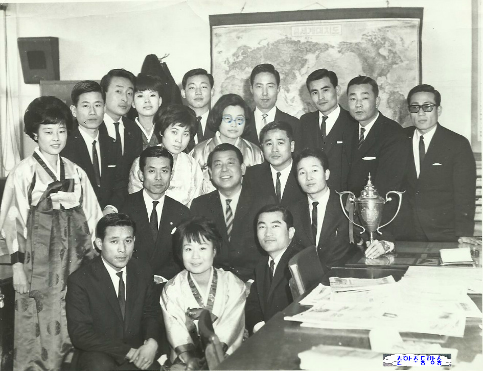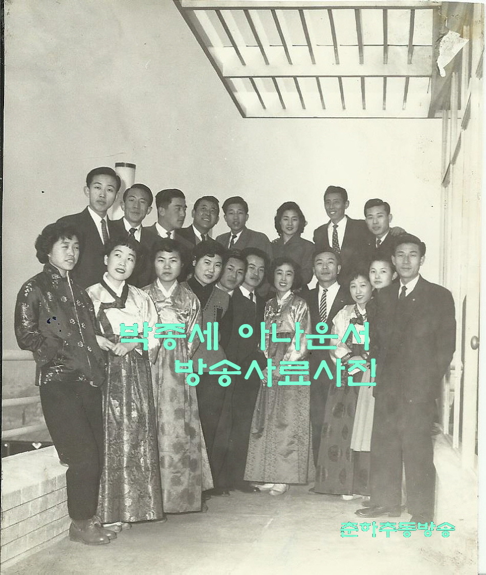 남산방송국으로 옮기던 첫해 1957년 연말특집 아나운서 언 파레이드를 마치고 촬영한 사진이다. 박종세 아나운서를 비롯해서 장기범, 민병연, 강영숙 ,황우겸, 김인숙, 최세훈, 송석두, 윤영중, 이현숙, 장금자, 송영필, 박종세, 이광재, 임택근, 강찬선, 임동순, 문복순, 강익수, 최계환님등 그 시절의 아나운서들이 모두 함께 했고 박종세, 이광재, 임동순아나운서는 1956년 KBS아나운서 입사 동기였다.