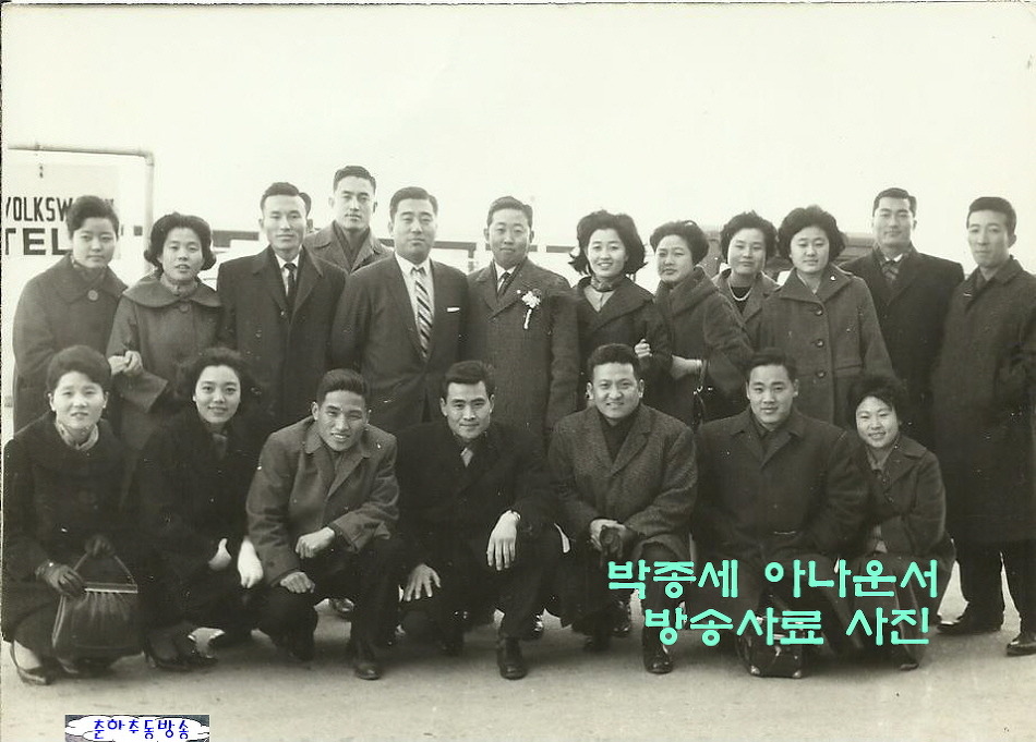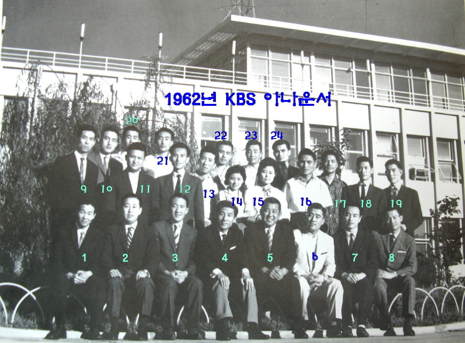 1958년 KBS 아나운서 앞줄 왼쪽부터 1.송영필, 2.강익수, 3.장기범, 4.임택근, 5.박종세, 6.최세훈, 7.이규영,8.강영숙, 9.전영우, 10.황우겸, 11.유석춘, 12.강찬선, 13.김동만, 14.최계환, 15.최두헌, 16.문복순, 7.장금자, 18.유창경, 19.이광재, 20.한경희 21.김준철, 22.최만린, 23.이현숙, 24.윤영중, 25.조영준, 26.이본 아나운서 (윤영중 아나운서 제공)