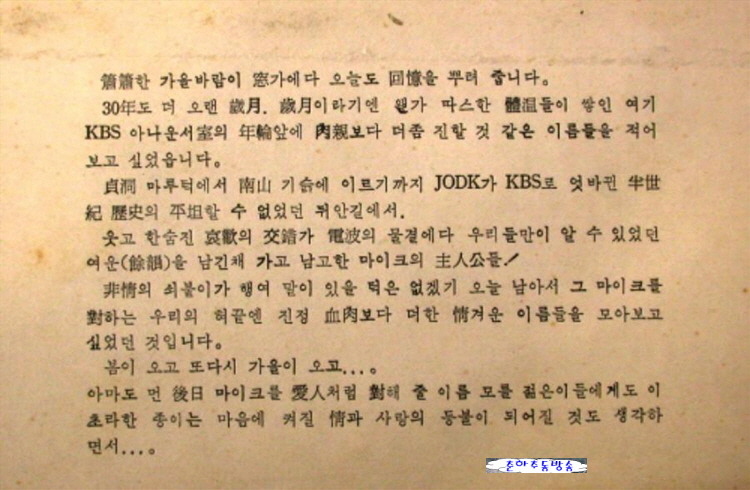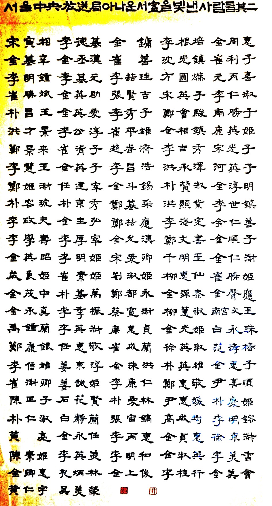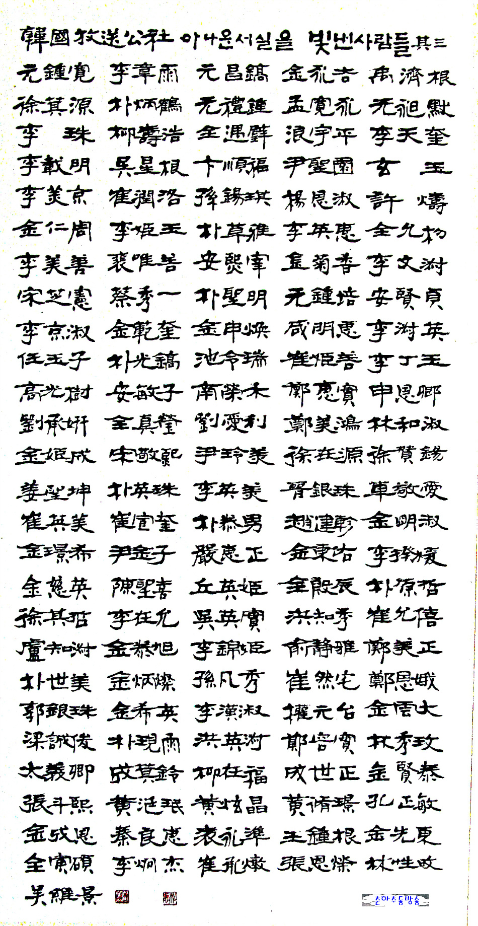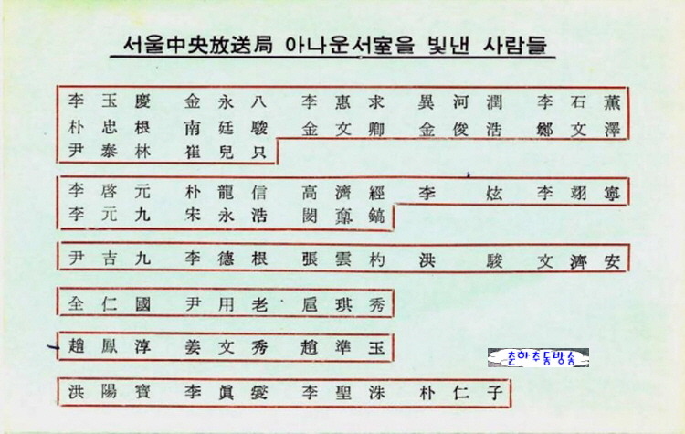 순서대로 또는 중앙의 아나운서를 기록하다보니 누락된 부분도 있고 또 기록상에 외국어 아나운서나 지역아나운서를 구분없이 작성한 결과도 있는것으로 보입니다. 설사 족보상 내용이 다소 착오가 있다해도 작성된 뒤 수정하기 어려움이 있을 줄 압니다. 어찌 되었던 첫번째 아나운서부터 오랜세월 이런 기록을 유지 한다는것은 대단한 일로 받아 드려지고 대한민국에서그 유례를 찾아보기 힘들 줄 압니다. 걸려있는 족자를 모두 춘하추동방송 블로그에 올리고 그 이후에 입사한 아나운서나 또 지역의 아나운서 인명록도 지역국별로 모두 올리려고 합니다. 아나운서실의 무궁한 발전을 기원하면서 지금까지 인명록을 올립니다.