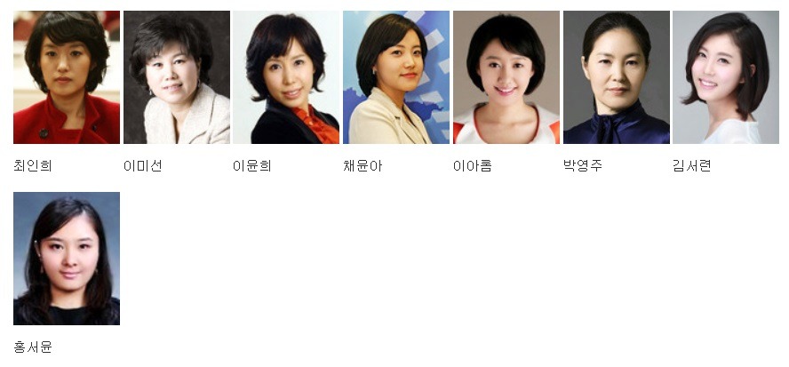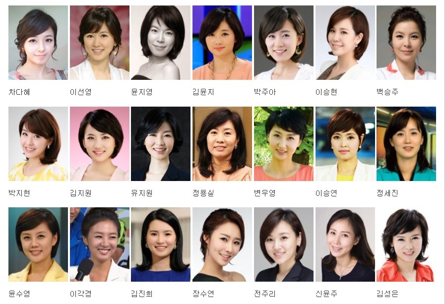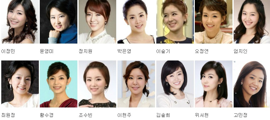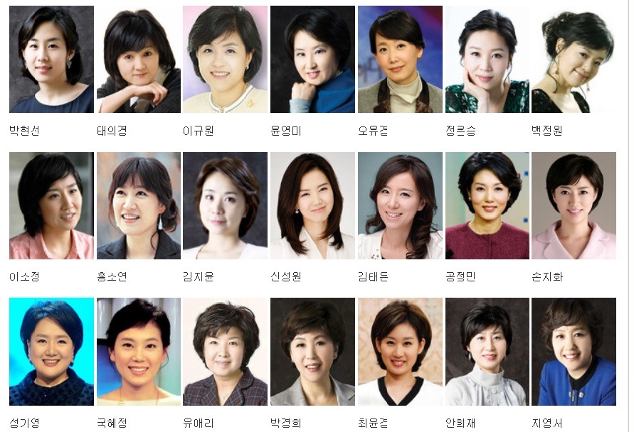현직 여자 아나운서 : 윤영미(아나운서실장), 이정민, 정지원, 박은영, 이슬기, 오정연, 엄지인, 최원정, 황수경, 조수빈, 이현주, 김솔희, 위서현, 고민정