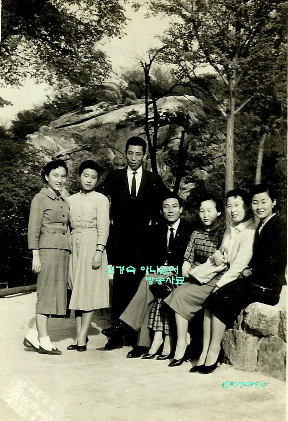 문복순 아나운서가 제공한 이 사진은 1958년 방송문화상이 발족하면서 장기범아나운서가 보도부문의 제1회 방송문화상을 받았다. 그날 시상식이 끝난후 장기범 아나운서와 1.최계환, 강익수, 김인숙, 5.윤길구 방송과장, 7.문복순, 8.민병연, 9.강찬선, 11.이규영, 12.황우겸아나운서가 함께 한 사진이다. 사진이다. 민병연(제공) 아나운서와 장기범 아나운서실장을 비롯한 아나운서들, 그리고 이승만대통령의 아들 이강석이 함께 한 사진. 1.최두헌, 2.유창경, 3.최세훈, 4.한경희, 5.민병연, 6.문복순, 7.황우겸, 8.장기범, 9..이강석, 10.강익수, 이강석은 틈이나면 남산에 있는 방송국을 들렸다. 남선 방송인들과는 개인적인 친분이 있었고 형님이고 누님이었으며 친구였다. 이강석과 남산의 방송인들과 촬영한 사진이 많고 본 블로그에도 몇장의 사진이 올라 있습니다. 김경숙 아나운서가 제공한 이 사진은 1959년 함께 들어온 동기생들이 입사교육을 시작하던 시절 1959년 5월 3일 남산약수터에서 촬영한 사진이다. 왼쪽 부터 김정현, 김순영, 강익수(계장), 장기범 (실장), 서선벽, 김현수, 김경숙으로 청일점 김주환은 이 사진에 없다.