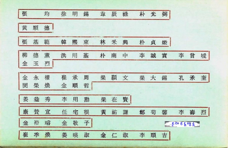 이홍우, 임문택, 안용민, 긴재영, 이영열, 윤신애, 조길자, 이계영, 소병규, 변웅전, 이승상, 송인상, 이덕기, 김 용, 이근배, 김주혜, 이기행, 김승한, 최 선, 심광진, 최이자, 이명종, 이기원, 이철규, 방원혁, 원병희, 최인아, 김영조, 장현길, 송영자, 이인숙, 박창옥, 김영애, 이수자, 정회준, 남승자, 홍재경, 이공순, 최평웅, 김상진, 강영희, 정경래, 최청자, 조춘재(조춘제), 이길수, 송광자, 이혜옥, 김영자, 이창호, 홍승택, 하영자, 정희숙, 임건재, 김두석, 박찬숙, 김순명, 박용호, 박동수, 정기채, 홍현업, 이세진, 이정부, 김규홍, 정철응, 이해완, 전인선, 이학수, 이후재, 김윤한, 정문희, 김순자, 김영소, 이명희,
