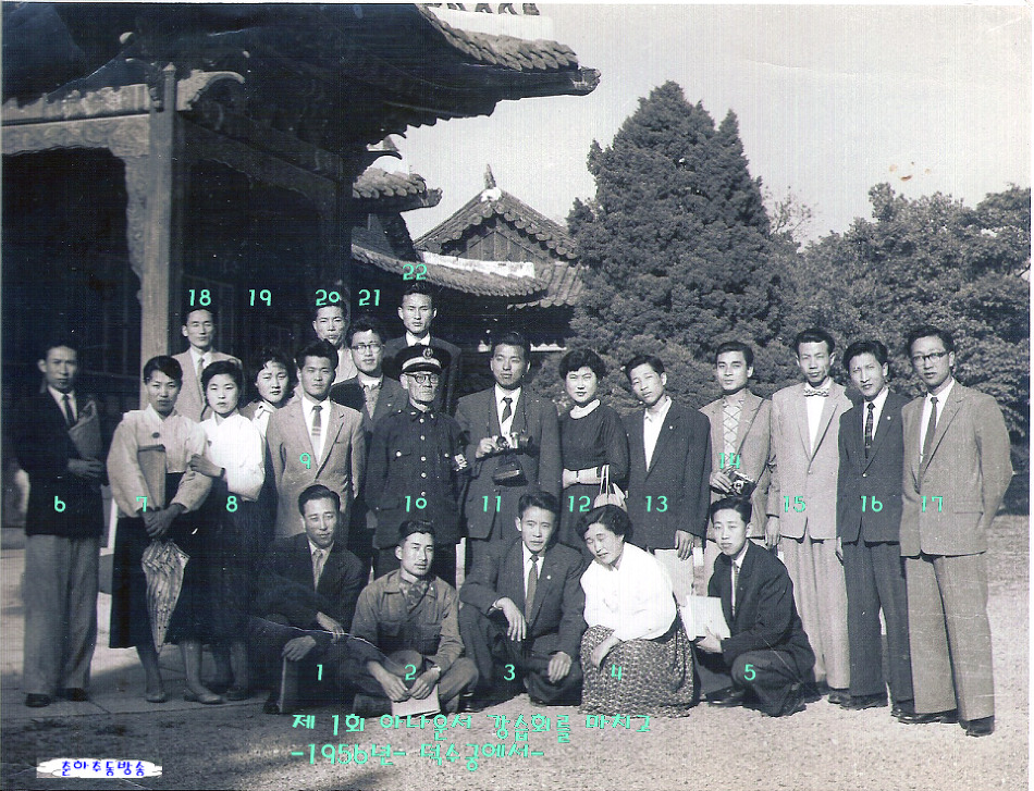아래는 역시 제1회 아나운서 강습회를 마치고 덕수궁에서 촬영한 사진으로 윤영중 아나운서가 제공한 사진입니다. 1.조창동, 2.정훈국 장대위, 3. 4. 5.박종세, 6.이완희, 7, 8.최재희, 9. 10. 11.백기홍, 12.윤영중, 13. 14. 15. 16. 17.황의돈, 18. 19. 20.서용수, 21. 22. 아나운서