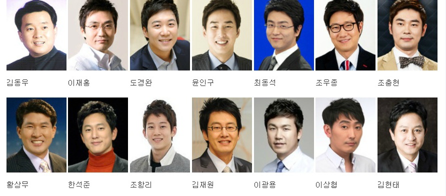 박태남, 김성수, 이규원, 김관동, 성기영, 유애리, 임수민, 안희재, 표영준, 이미선, 강성곤, 김은성, 홍소연, 윤인구, 이재후, 이재홍, 장 웅, 배창복, 김현욱, 최윤경, 박주아, 이지연, 김기만, 정은승, 김경란, 이영호, 백승주, 이상호, 박현선, 김보민, 김윤지, 한석준, 박사임, 최동석, 고민정, 김진희, 조우종, 이선영, 이정민, 윤수영, 김흥수, 조건진, 전인석, 서기철, 태의경, 정용실, 황수경, 성세정, 김성은, 김현태, 이형걸, 이성민, 김재원, 한상권, 김홍성, 백정원, 신윤주, 원석현, 김태규, 이창진, 신성원, 전현무, 이지애, 오정연, 지영서, 박영주, 황정민, 최승돈, 오유경, 유지철, 최시중, 정세진, 국혜정, 윤지영, 오태훈, 변우영, 이규봉, 최원정, 김정화, 이상협, 김희수, 김지윤, 이승연, 위서현, 이광용, 김재홍, 조수빈, 오언종, 박은영, 박지현, 엄지인,