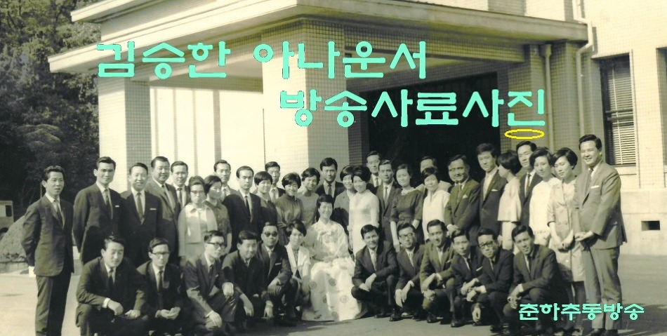 김승한 아나운서 깊숙한 앨범에서 나온 아 주 귀한 사진이다(이 사진은 김정자아나운서로 부터 사진에도 있었다). 노란 색 0 밑 김승한 1966년으로 추정되는 KBS 중앙방송국 (우리말 라디오 & TV)과 국제빙송국 (외국어) 아나운서들이 청와대 초청을 받고 얘기를 나눈후 기념으로 촬영한 사진이다. 얘기를 나눌 때까지는 박정희 대통령도 함께 참석했지만 중간에 사정이 생겨 출타한 관계로 이 사진속에 박정희 대통령은 없다. 우선 아는 성함을올려 드리고 성함이 더 확인 되는대로 번호를 매겨 더 확실하게 올리도록 할것이다. 앞 줄 왼쪽부터 이규항, 방원혁, 김용, 김재영, 이병렬, 김규은, 대통령 영부인 육영수 여사, 소병규, 이근배, (?), 임문택, 이팔웅, 김기행 아나운서, 뒷줄 서 있는 사람 왼쪽부터 (?), 송한규, 이광재. 강찬선, 최규락, 이종명 (일어) 한 사람 건너, 송인상, 최징훈(영어) 한사람 건너, 최두헌, 이소원, 한 사람 건너 김용문(불어), 김정자, 박용순(일어), 최경호(중국어), 손상욱(일어), 네 사람 건너, 이우백(일어)두사람 건너 김승한, 김영애, 이수자, 최승빈 아나운서 오래된 사진이고 많은 분들이 함께 촬영해서 얼굴을 잘 볼 수 없어덜 쓴 분도 있고 혹시 잘못된 분도 있을 것임으로계속 확인해서 보완 하도록 하겠습니다.