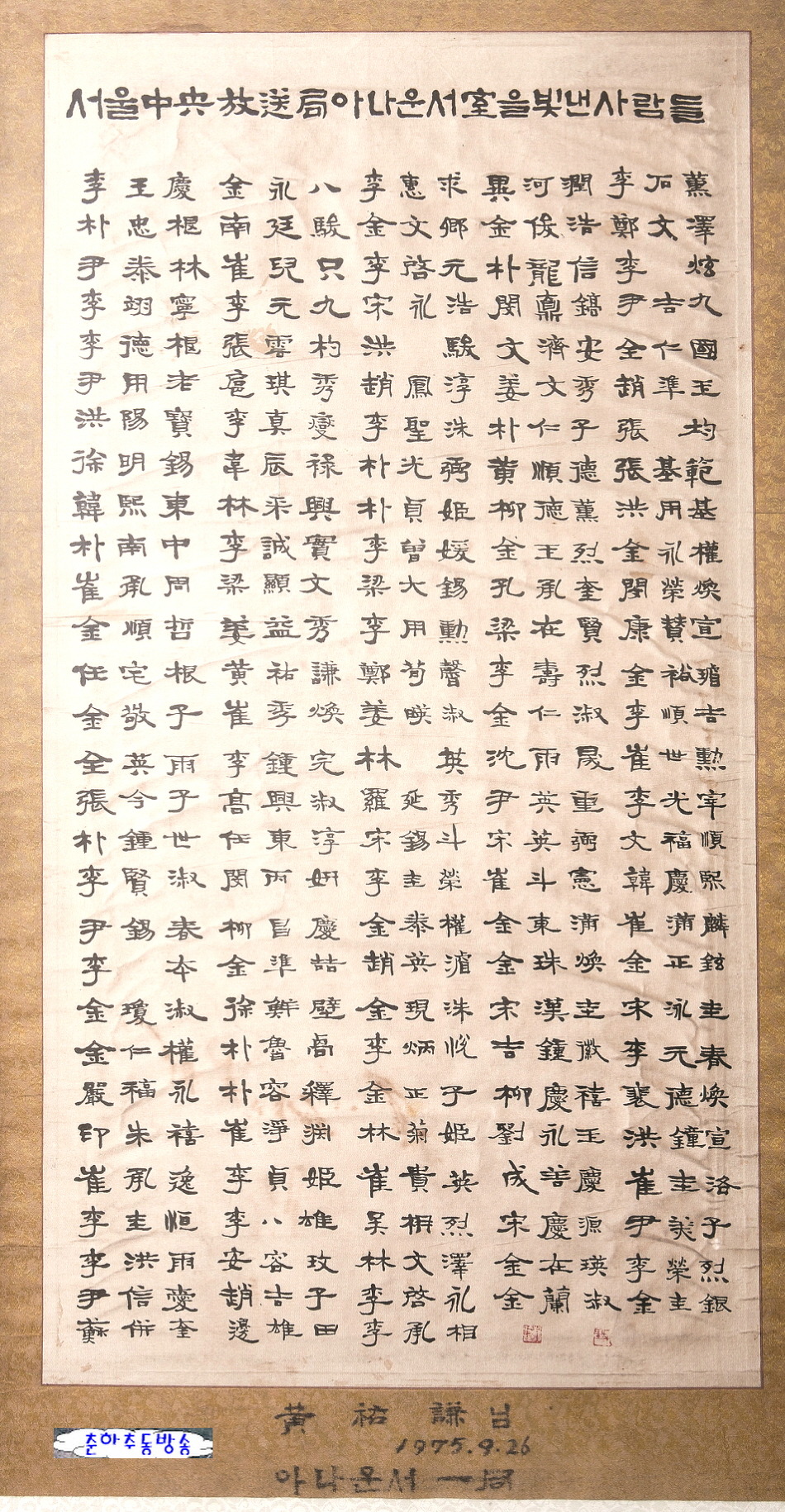 1975년 최계환 아나운서실장 시절 선배 아나운서 황우겸님이 새로운 집을 마련해서 입주 할때 그 기념으로 아나운서실에서 드린것인데 잘 보관하고 계셔서 KBS 저널 한지은 기자가 취재차 황우겸 님 댁을 방문했다가 사진으로 촬영 해서 보내 준 것이고 또 두편은 2006년 아나운서 재직 중이던 김윤한 아나운서가 촬영해서 보내 주셨습니다. 끝부분에 두편의 족보가 있습니다.
