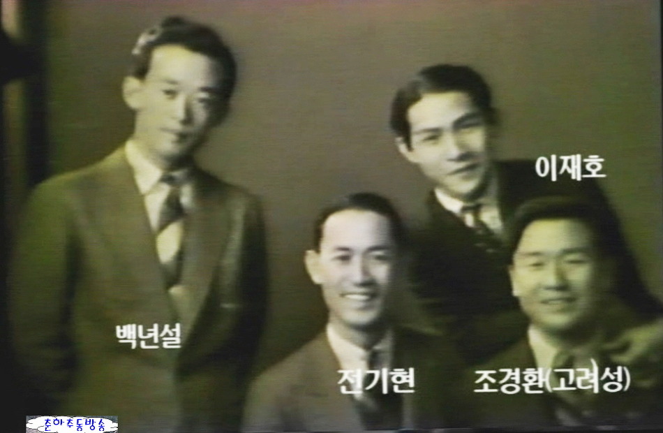 위는 나그네 설움 작사, 작곡 노래를 부른 조경환(고려성), 이재호, 백년설이 함께 한 사진이다. 전기현은 일제강점기 이름있던 작곡가였다. 아래는 대표곡 대지의 항구 작사, 작곡, 노래를 함께 한 분 김영수, 이재호, 백년설의 모습이다.