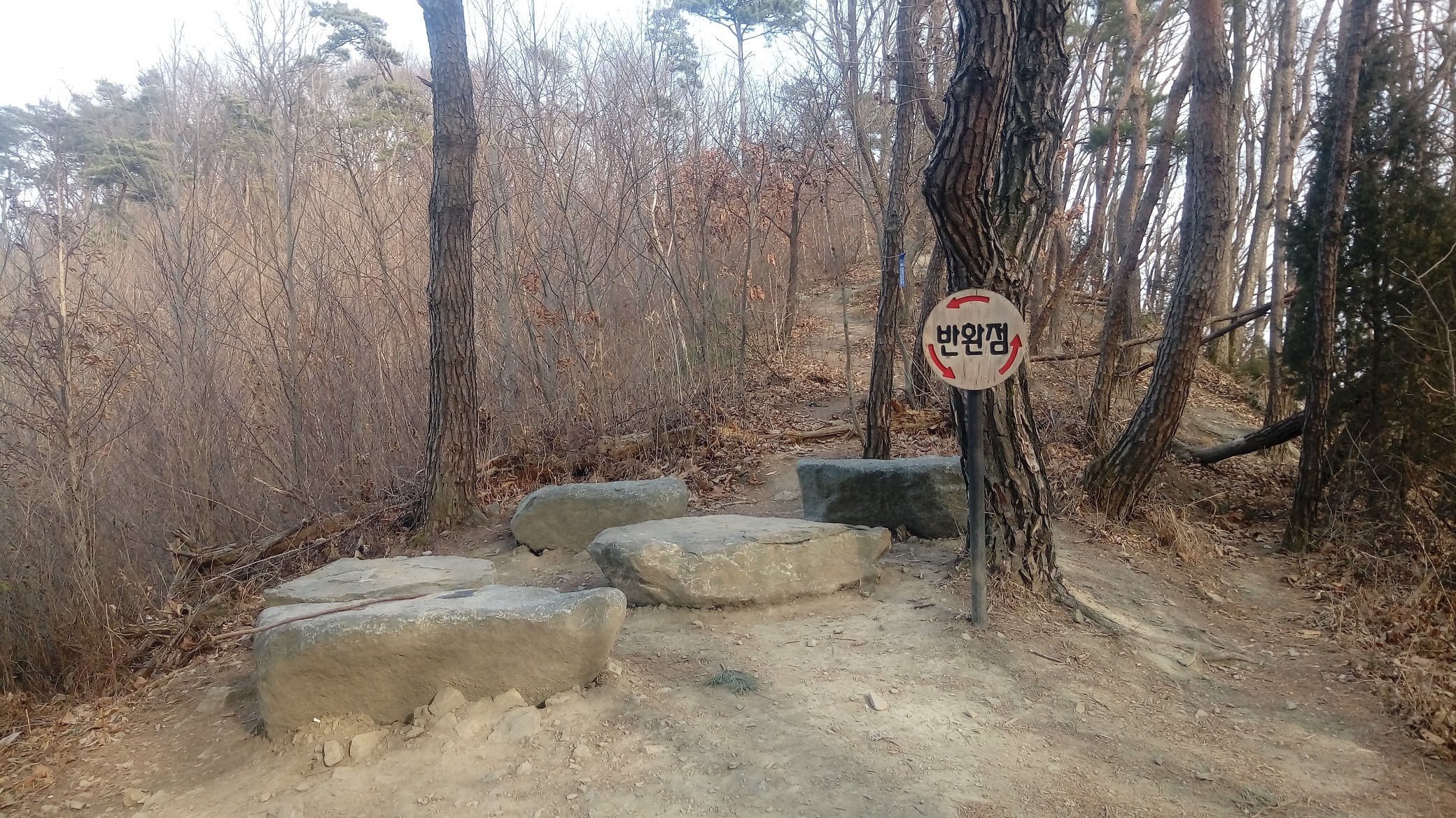 (16:19) 서남쪽으로 1분여 내려서니 ‘반환점’ 표시판과 함께 돌벤치가 보였고, 이어 ‘↓정상 180m’ 표시목이 있는 갈림길인데, 직진하면 ‘마느실저수지’로 이어질 듯하였다. 오른쪽 길로 나아가 4분여 뒤 돌벤치에 이르니 ‘↓정상 456m’ 표시목이 보였고, 길은 왼쪽(남남동쪽)으로 휘었다가 오른쪽(서북쪽)으로 휘어 다시 능선에 닿는다. 왼쪽으로 휘는 등산로를 버리고 덤불 사이 흐릿한 능선길로 나아가니 왼편에 묘지가 보인 데 이어 ‘여수울산’ 정상이다.