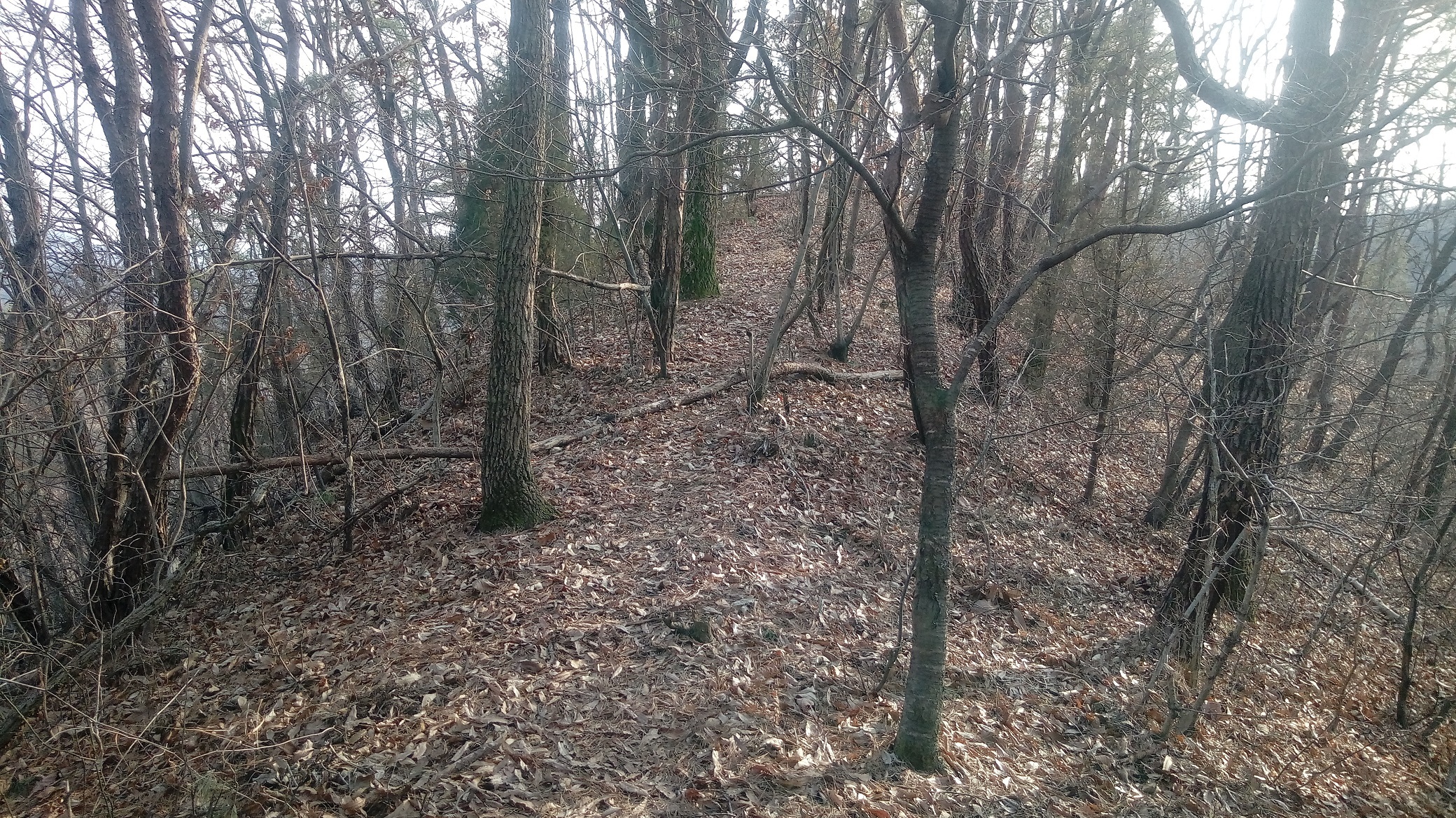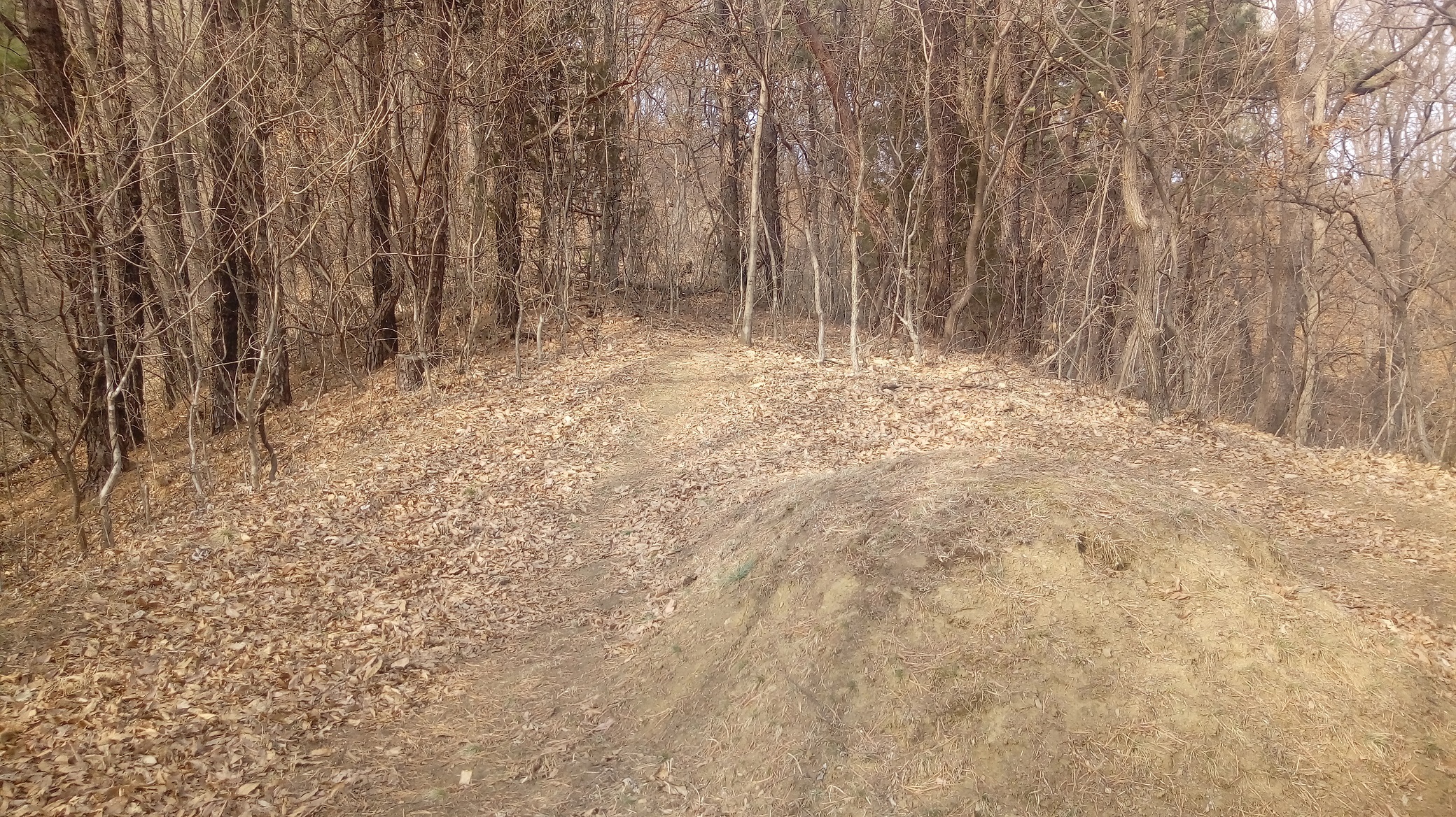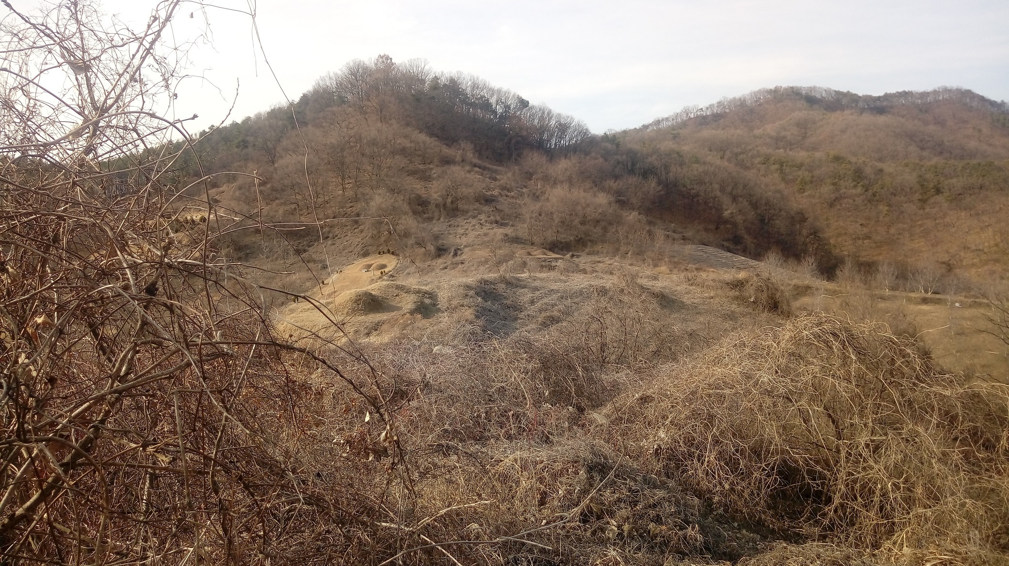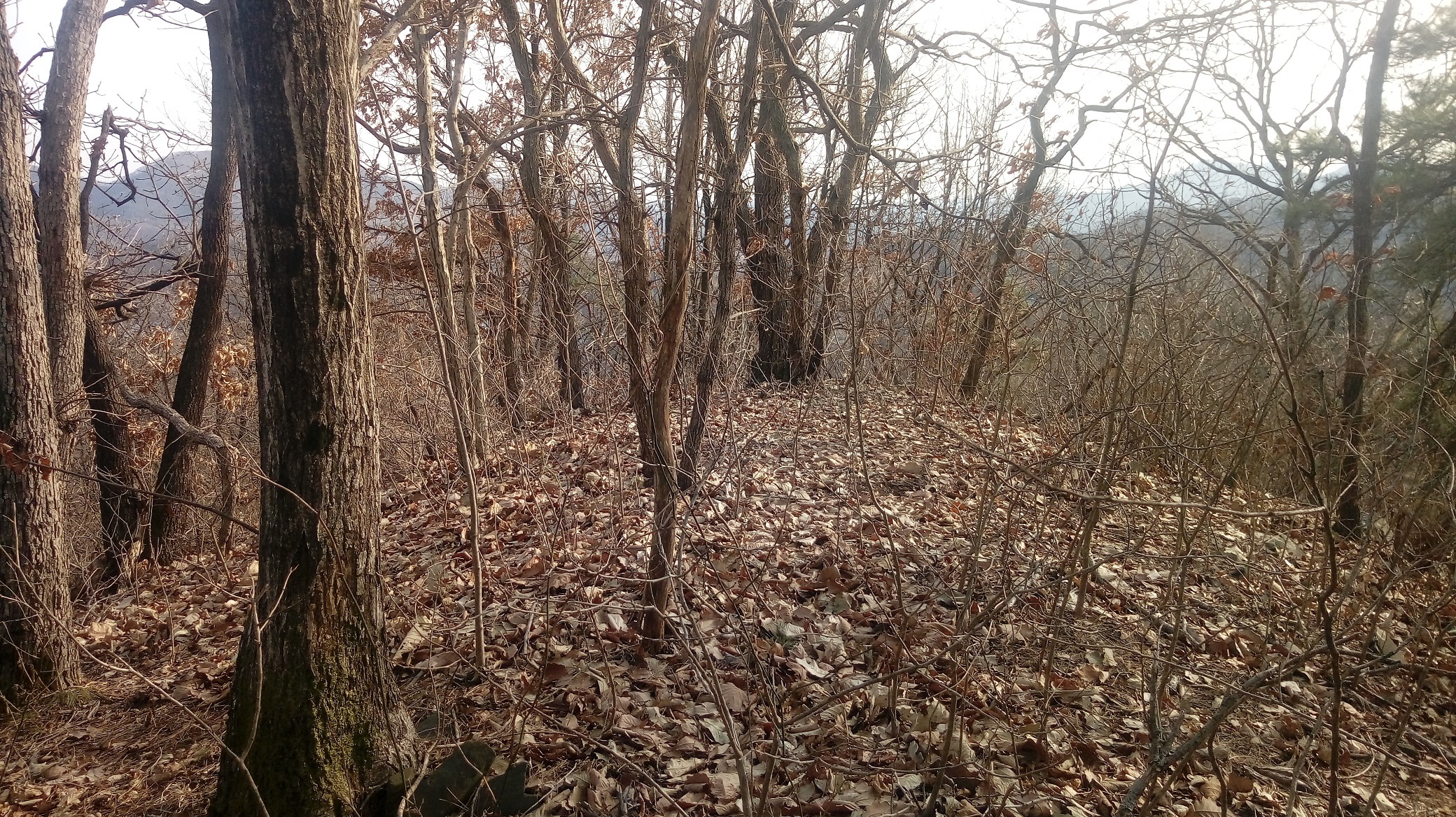 (15:47) 조망이 없는 ‘뒷동산’ 정상에는 몇 개의 표지기가 걸려 있다. 가시와 잡목덤불을 헤치고 내려서니 흐릿한 산길이 보였고, 아담한 무덤을 지나니 양호한 산길이 이어졌다. 앞쪽이 덤불인 포장길에 닿아 오른쪽으로 나아가다 1분여 뒤 왼쪽(서북쪽) 산길로 오르니 오른쪽으로 휘어 무덤에 닿는다. 왼편에 보이는 쌍묘와 묘지에 이르니 길은 끝나는데, 뒤편 급사면을 치고 올라 잡목 음달분맥의 언덕(~255m)에 닿았다.
