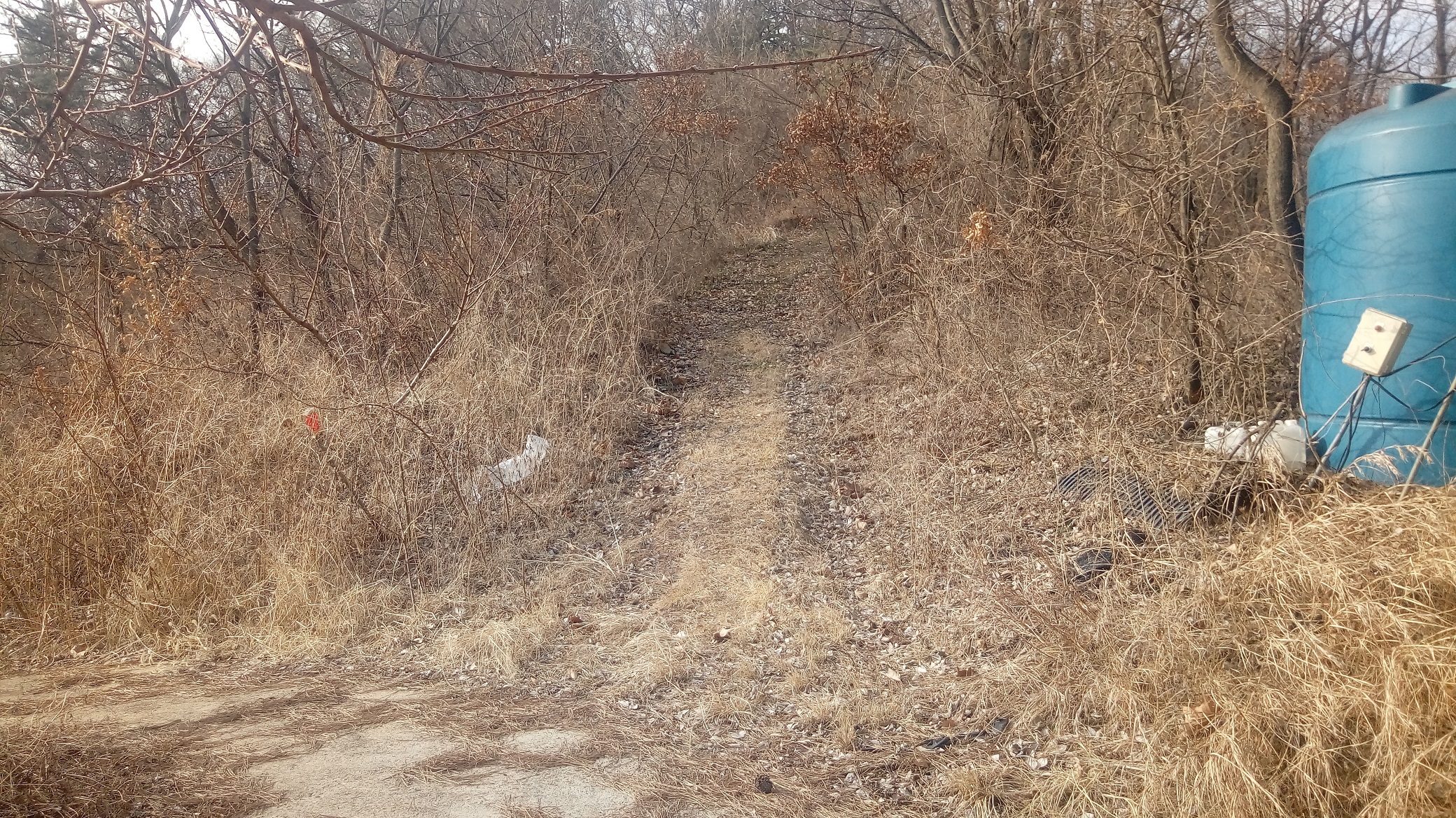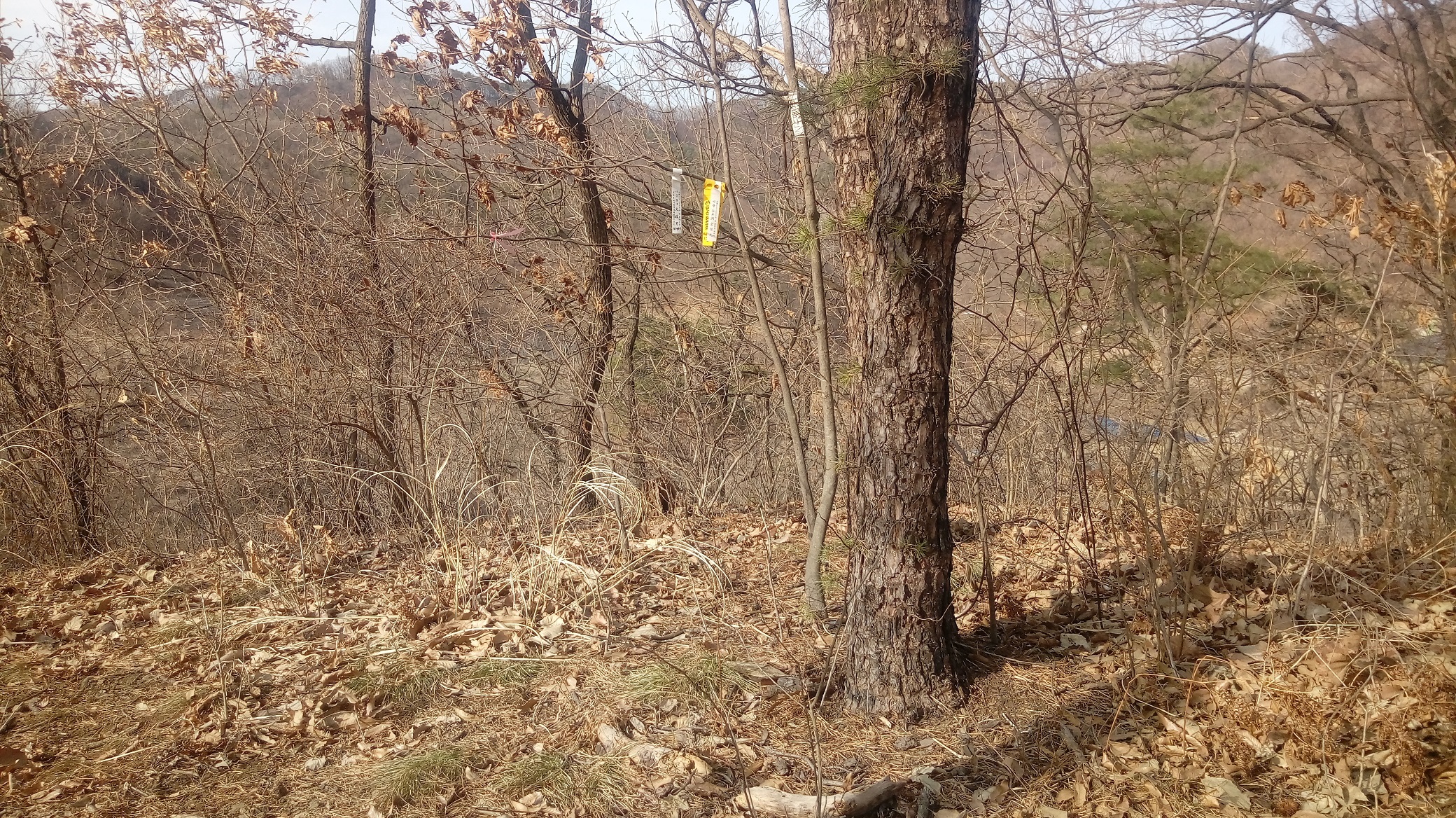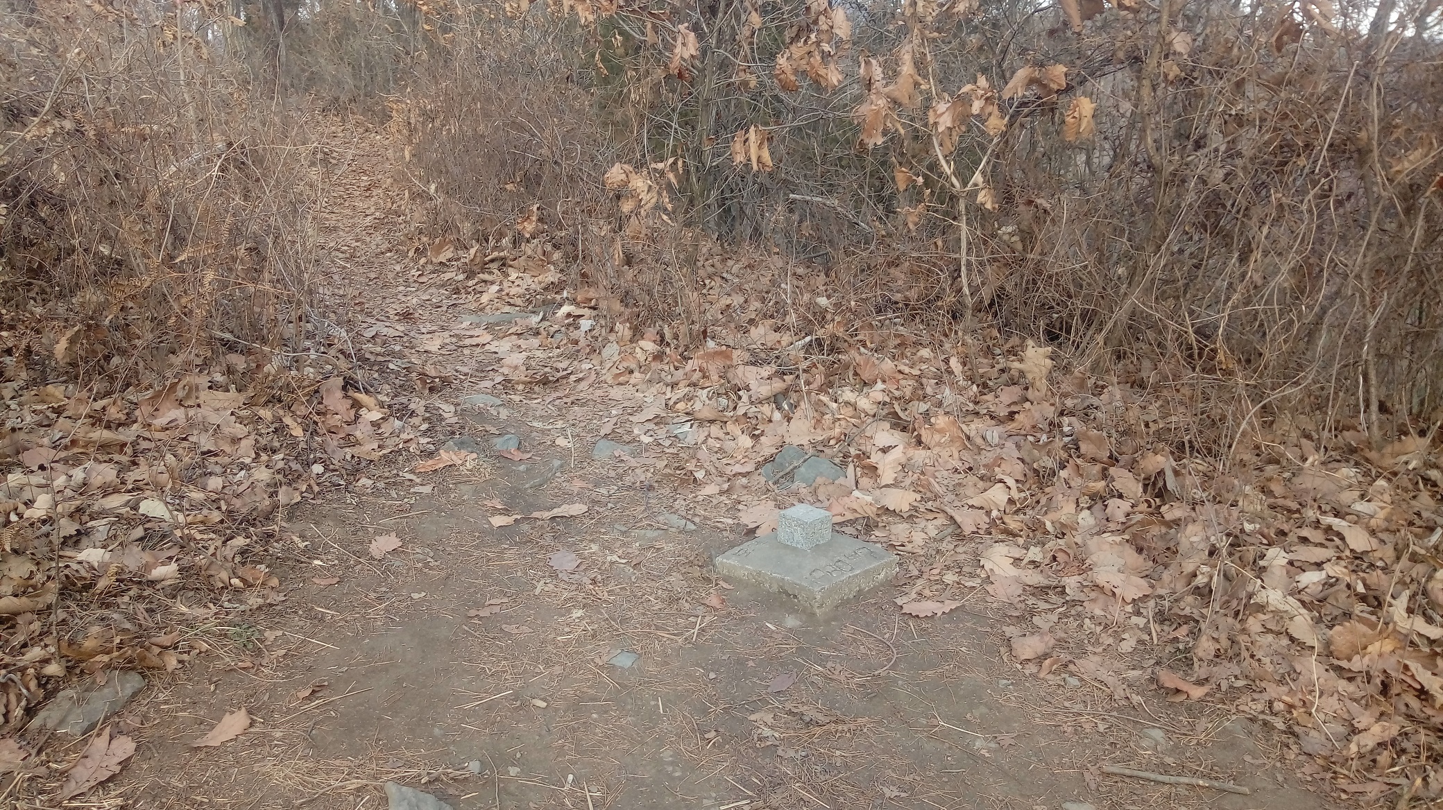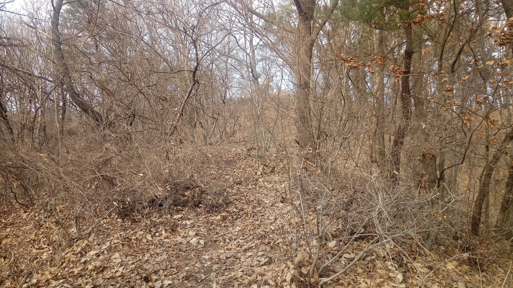 (15:47) 조망이 없는 ‘뒷동산’ 정상에는 몇 개의 표지기가 걸려 있다. 가시와 잡목덤불을 헤치고 내려서니 흐릿한 산길이 보였고, 아담한 무덤을 지나니 양호한 산길이 이어졌다. 앞쪽이 덤불인 포장길에 닿아 오른쪽으로 나아가다 1분여 뒤 왼쪽(서북쪽) 산길로 오르니 오른쪽으로 휘어 무덤에 닿는다. 왼편에 보이는 쌍묘와 묘지에 이르니 길은 끝나는데, 뒤편 급사면을 치고 올라 잡목 음달분맥의 언덕(~255m)에 닿았다.