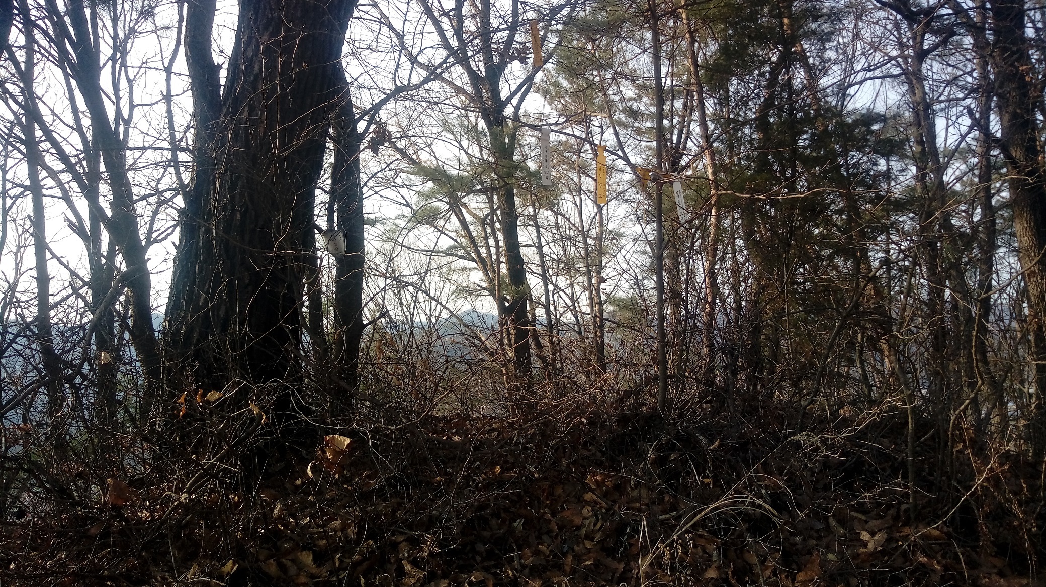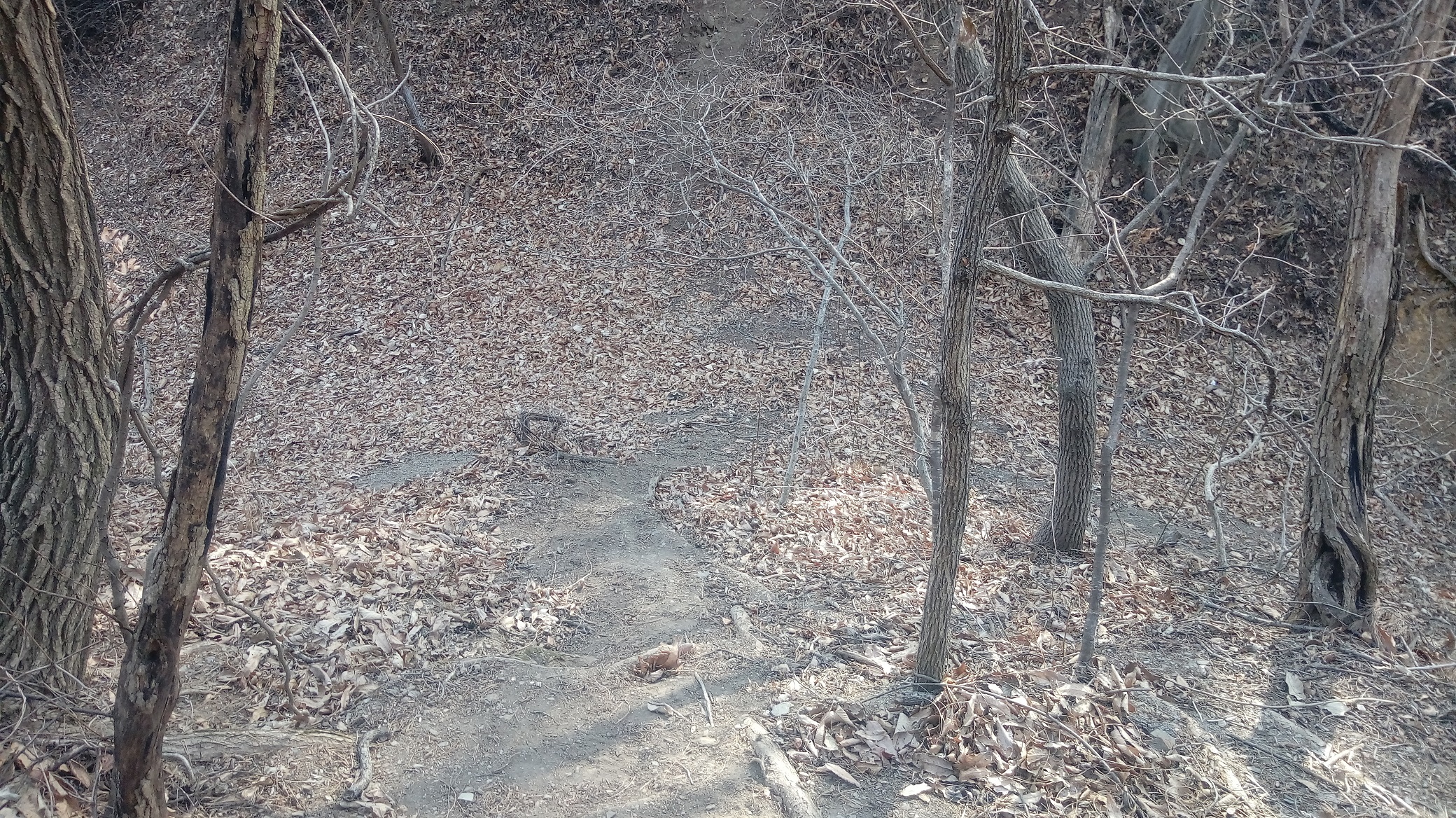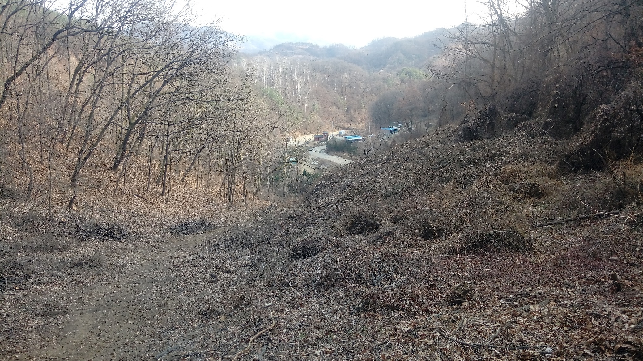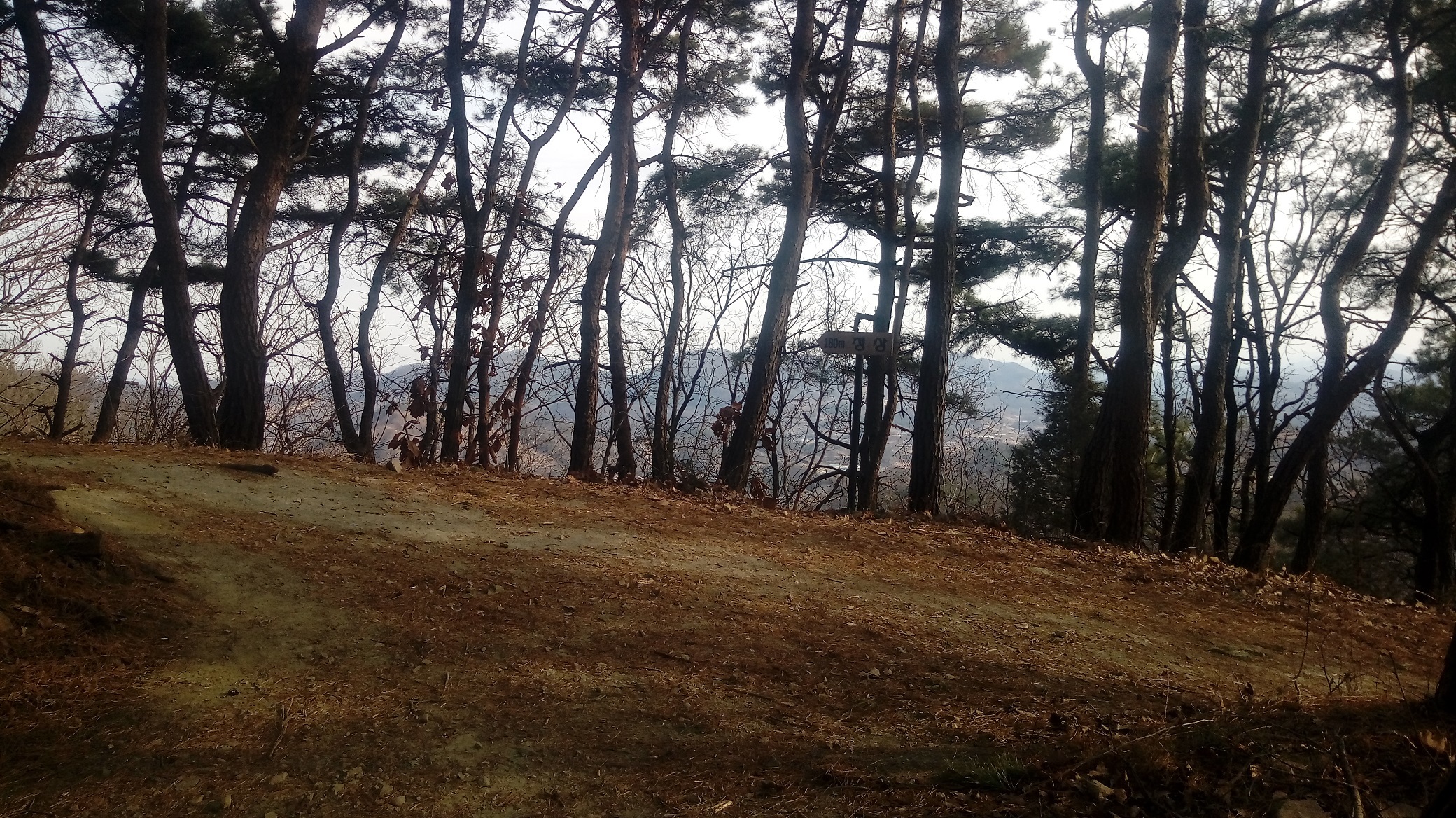 (15:47) 조망이 없는 ‘뒷동산’ 정상에는 몇 개의 표지기가 걸려 있다. 가시와 잡목덤불을 헤치고 내려서니 흐릿한 산길이 보였고, 아담한 무덤을 지나니 양호한 산길이 이어졌다. 앞쪽이 덤불인 포장길에 닿아 오른쪽으로 나아가다 1분여 뒤 왼쪽(서북쪽) 산길로 오르니 오른쪽으로 휘어 무덤에 닿는다. 왼편에 보이는 쌍묘와 묘지에 이르니 길은 끝나는데, 뒤편 급사면을 치고 올라 잡목 음달분맥의 언덕(~255m)에 닿았다.