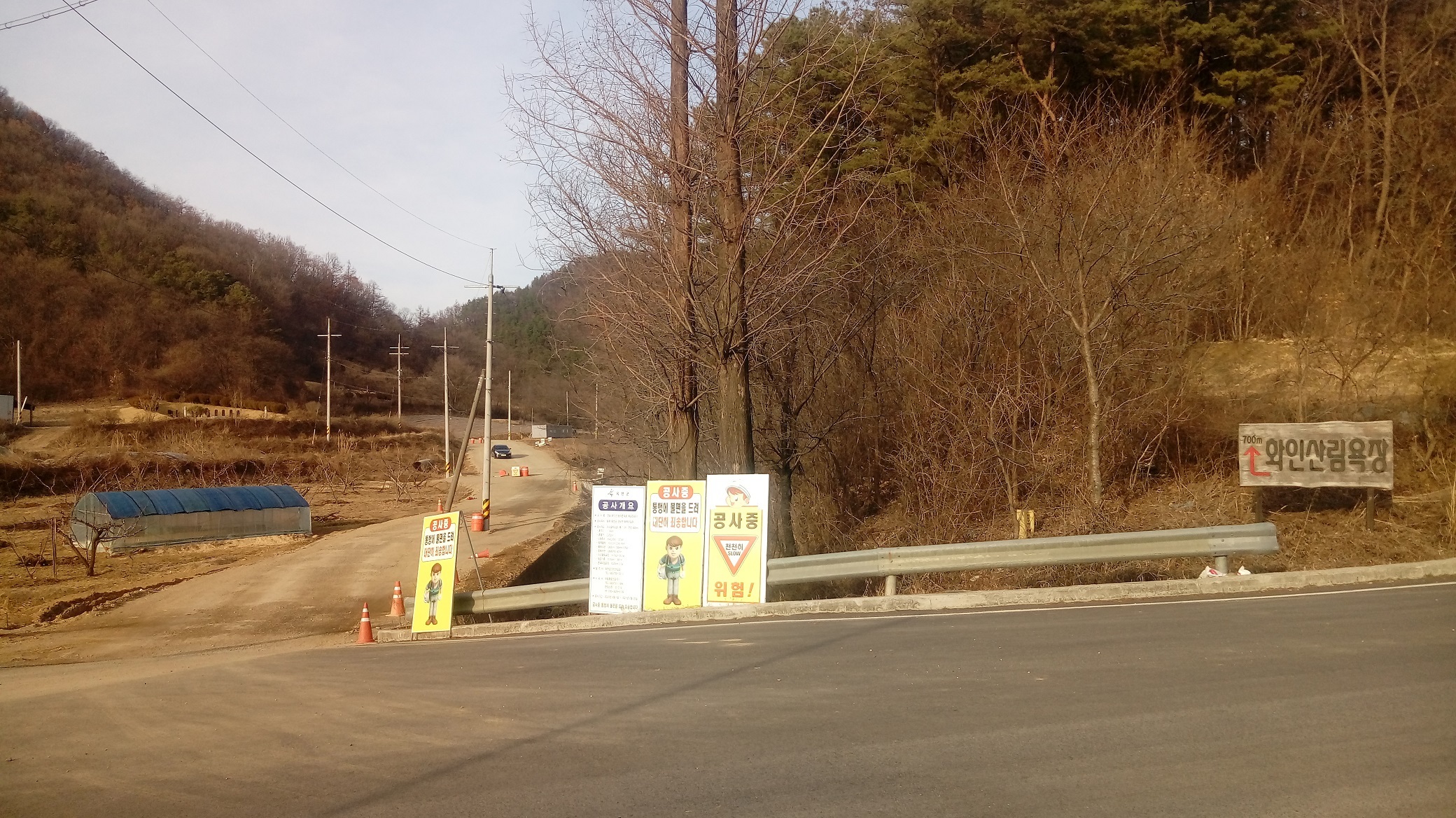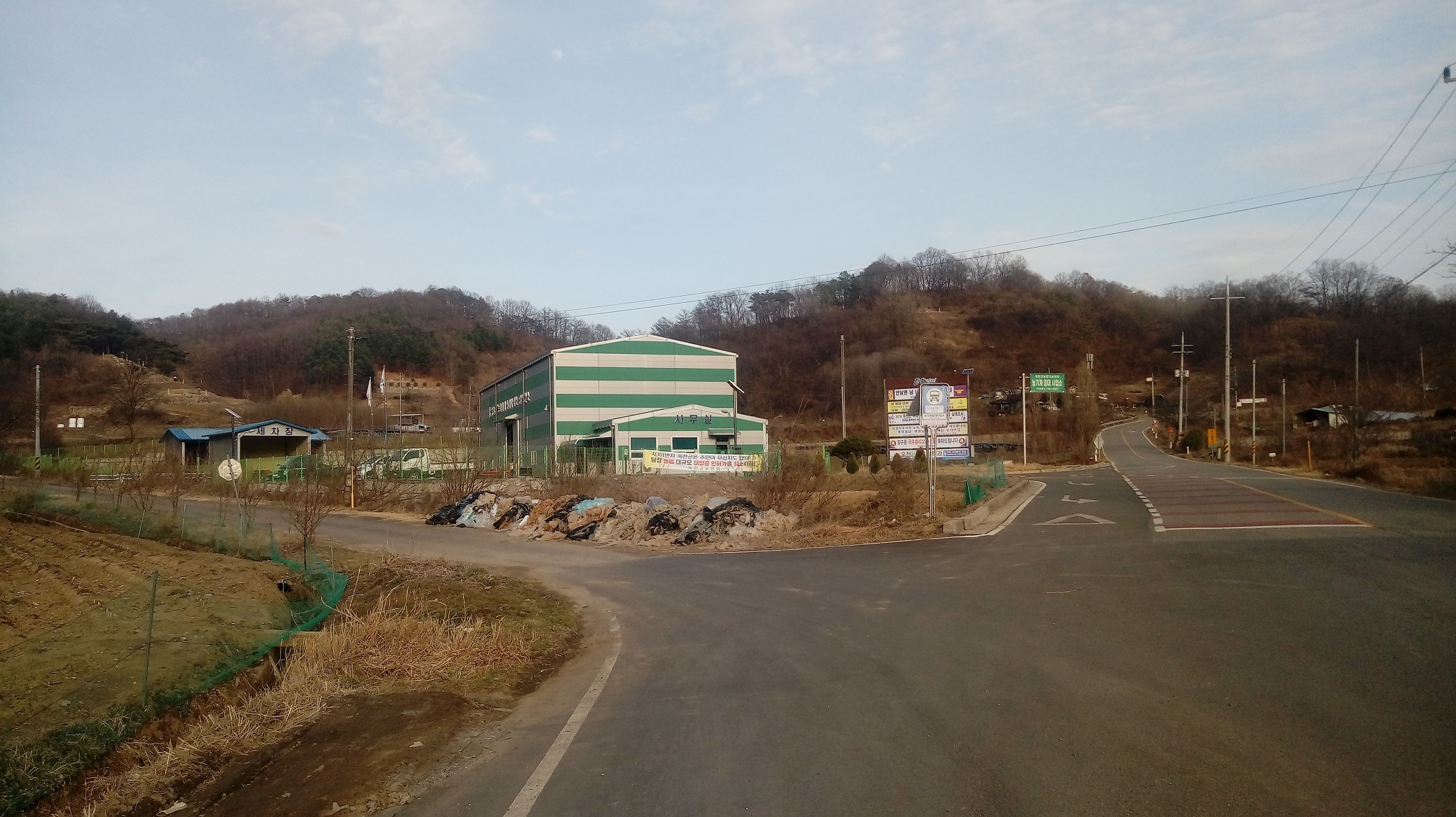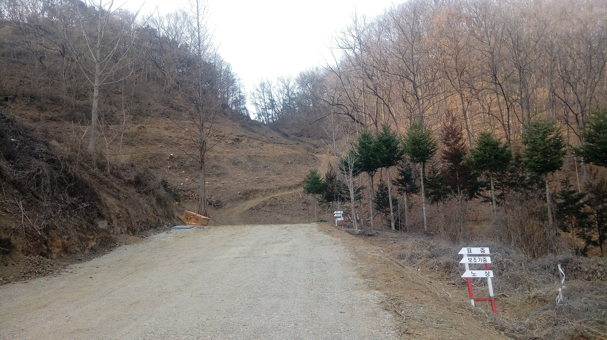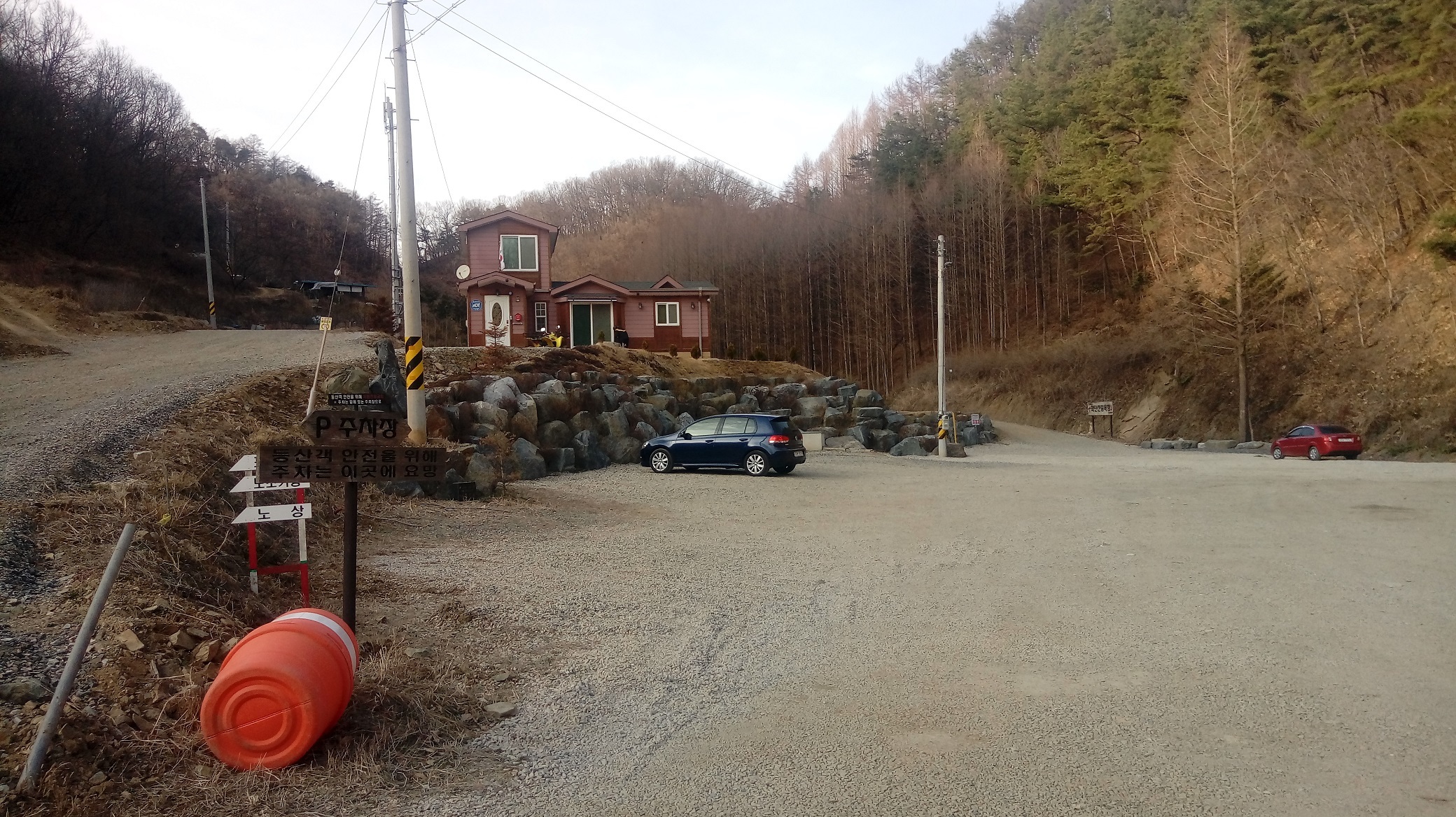 (16:31) 시야가 없는 ‘여수울산’ 정상에는 몇 개의 표지기가 걸려 있다. 흐릿한 산길을 따라 5분여 뒤 안부(‘리묵재’)에 이르니 흐릿한 고갯길이 자취가 남아 있다. 왼쪽 골짜기로 내려서서 3분여 뒤 오른편에서 산판길을 만났고, 포장 준비중인 너른 길을 따라가니 왼편 아래에 작은 못과 함께 등산로가 보였다. 간이주차장에 이르니 ‘화인산림욕장’ 표시목이 보였고, 갈림길에서 오른편의 예전 길을 따르니 ‘↓산림욕장 600m’ 표시목과 함께 오른쪽에서 갈림길을 만난다. 다시 너른 길을 만나 ‘농기계임대사업소(화인수목원)’ 버스승강장이 있는 도로에 이르니 옥천 방면 버스승강장은 왼쪽 ‘농기계임대사업소’ 건물 앞에 있다.
