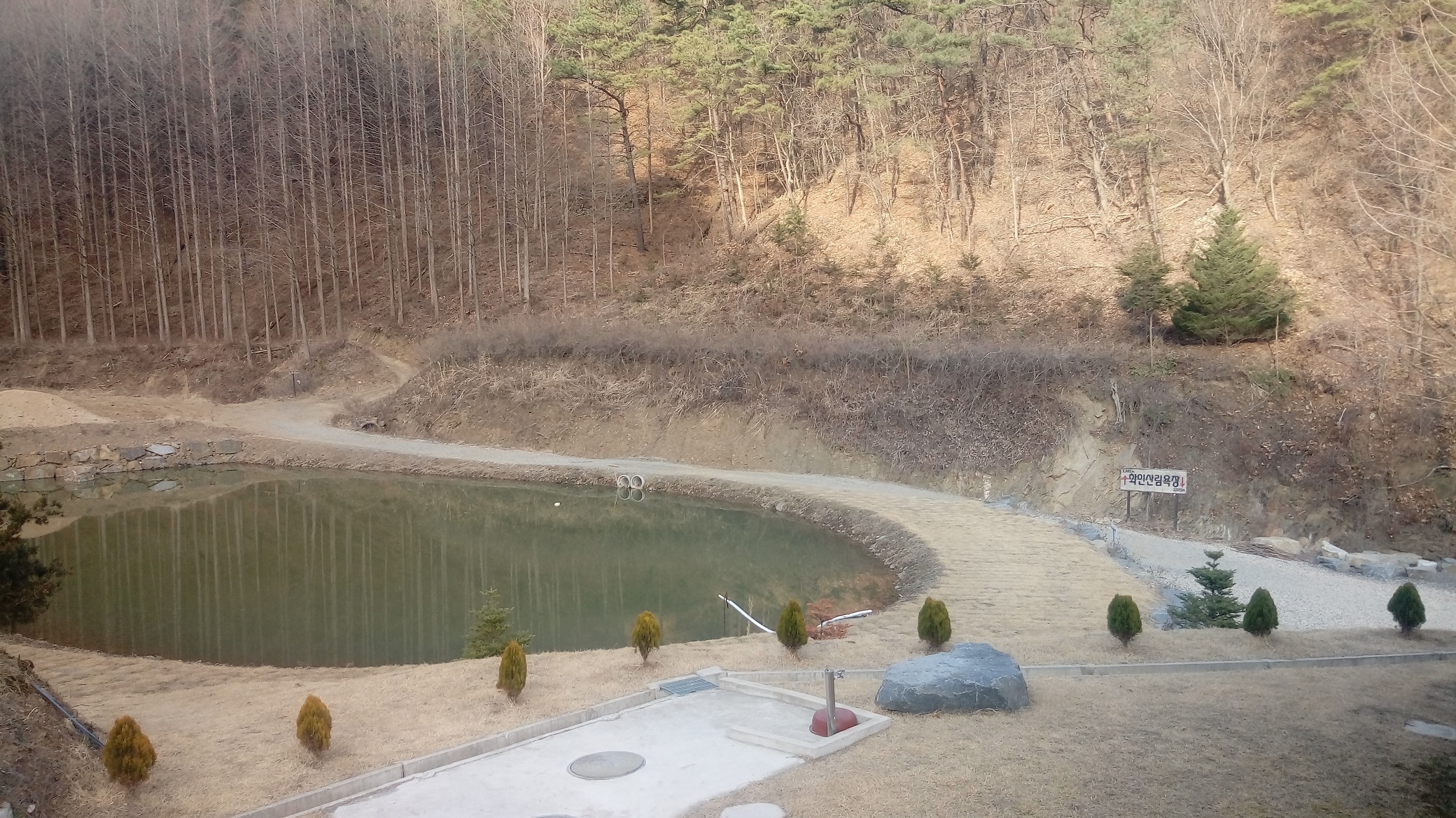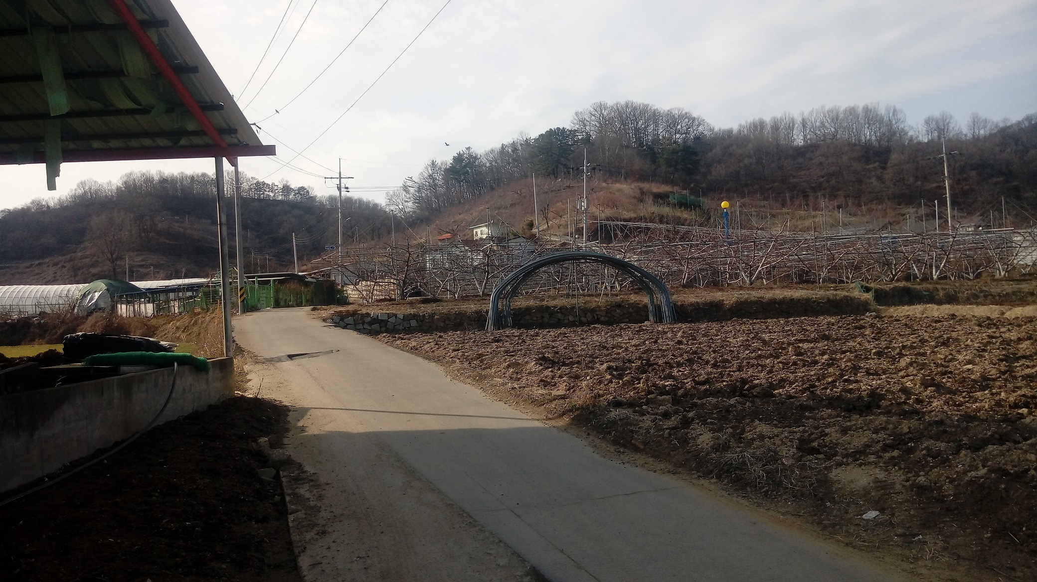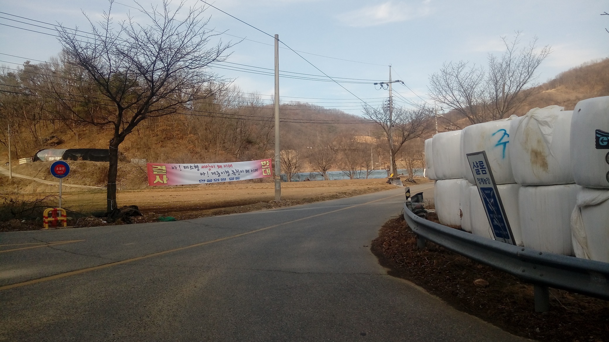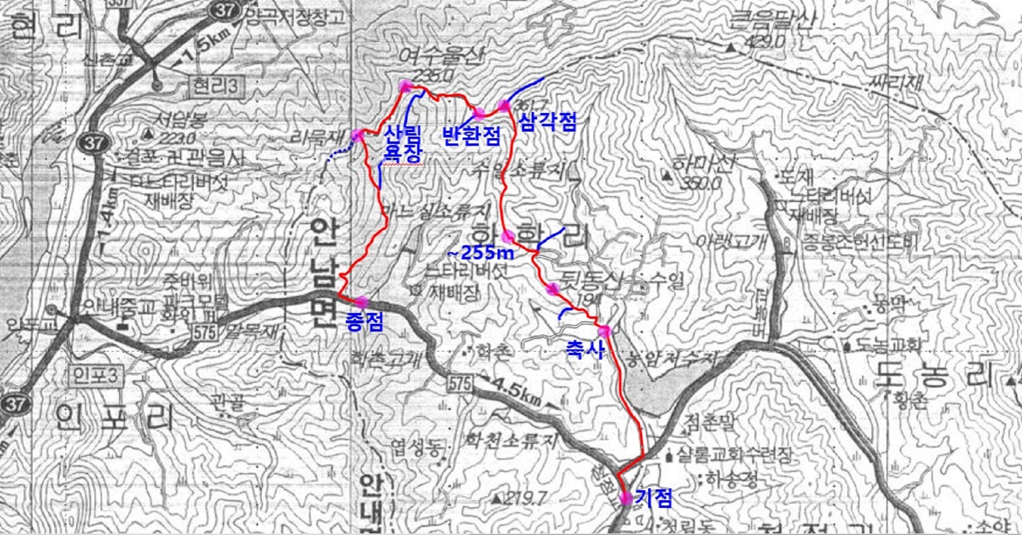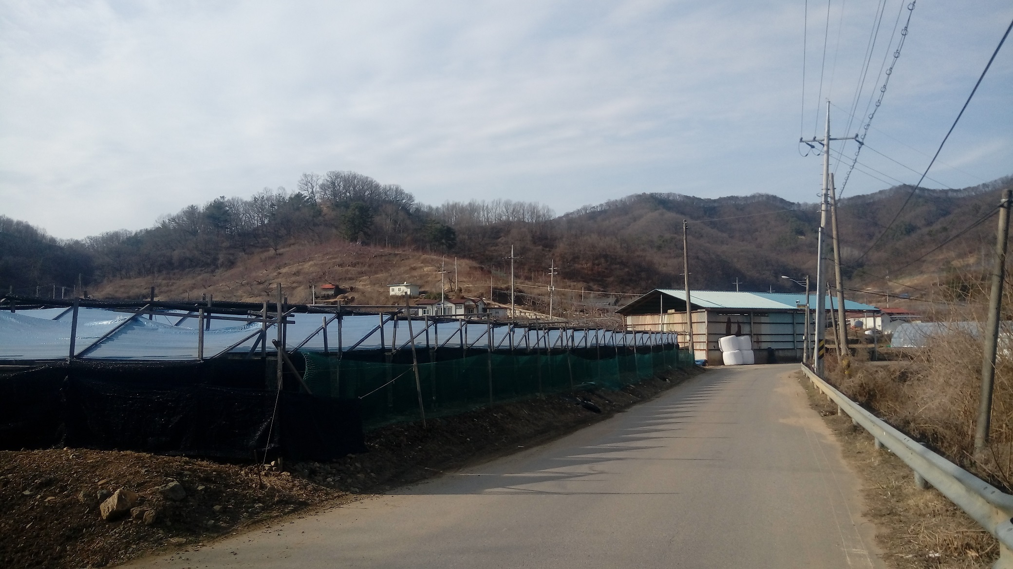 (16:31) 시야가 없는 ‘여수울산’ 정상에는 몇 개의 표지기가 걸려 있다. 흐릿한 산길을 따라 5분여 뒤 안부(‘리묵재’)에 이르니 흐릿한 고갯길이 자취가 남아 있다. 왼쪽 골짜기로 내려서서 3분여 뒤 오른편에서 산판길을 만났고, 포장 준비중인 너른 길을 따라가니 왼편 아래에 작은 못과 함께 등산로가 보였다. 간이주차장에 이르니 ‘화인산림욕장’ 표시목이 보였고, 갈림길에서 오른편의 예전 길을 따르니 ‘↓산림욕장 600m’ 표시목과 함께 오른쪽에서 갈림길을 만난다. 다시 너른 길을 만나 ‘농기계임대사업소(화인수목원)’ 버스승강장이 있는 도로에 이르니 옥천 방면 버스승강장은 왼쪽 ‘농기계임대사업소’ 건물 앞에 있다.