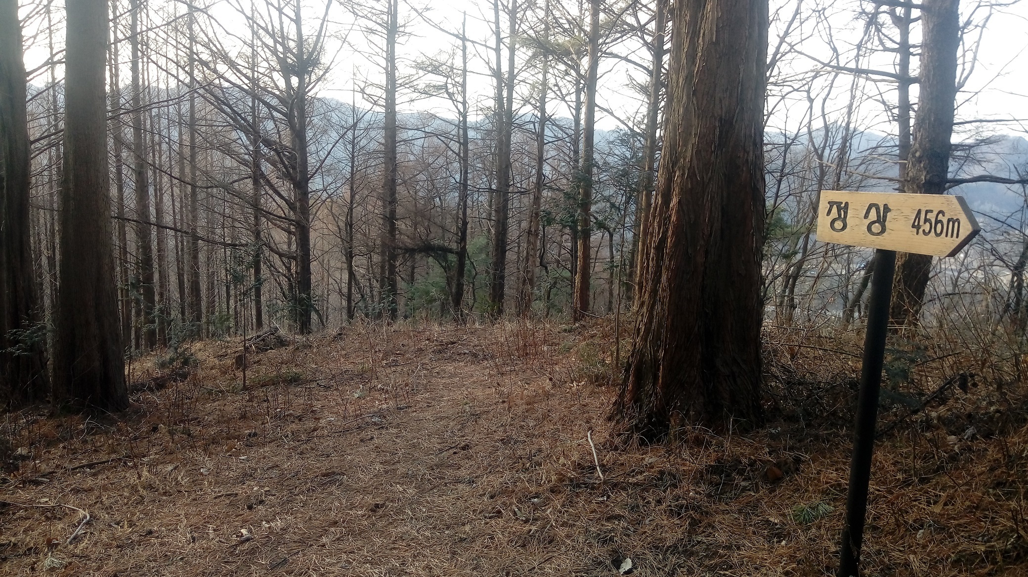 (15:28) 북쪽으로 나아가다 2분여 뒤 오른쪽(동북쪽) ‘중봉로’에 들어섰고, 조금 뒤 왼쪽 ‘화학4길’에 들어섰다. 저수지를 지나 축사가 자리한 데서 왼쪽(서쪽) 길에 들어서니 이내 갈림길인데, 오른쪽(북북동쪽)으로 가다 왼쪽 능선으로 난 포장길에 올라섰다. 물통과 움막이 있는 데서 포장길을 버리고 오른편 능선길로 오르니 ‘龍宮全公明植·配密陽孫氏重述之墓’ 등의 묘지에서 끝나는데, 뒤편 흐릿한 산길로 오르니 무덤 몇 개가 이어진 후 잠깐의 잡목덤불을 헤치고 정상에 도착하였다.