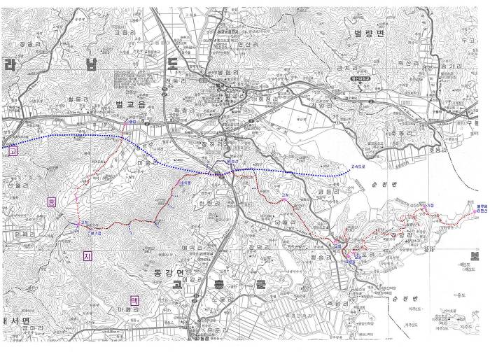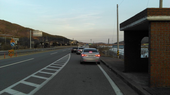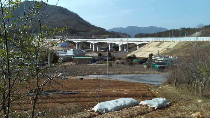 (14:15) 안부(‘두평치’)에 이르니 왼쪽으로 내리막길이 보였고, 직진하니 길 흔적은 흐릿해지는데, 6분여 뒤 왼쪽 사면을 치고 내려가니 분맥이 아닌 듯하였다. 오른편 사면을 치고 나아가 두 개의 무덤에 닿아 서쪽으로 내려서다 다음 무덤들에 이르니 첨산이 정면으로 바라보이길래 분맥이 아님을 확인하고 다시 오른편 사면을 치고 나아가 능선에 이르니 잡목덤불이 빼곡하였다. 서쪽으로 내려서다가 오른편으로 비끼니 덤불을 이룬 묵밭에 닿았고, 서쪽으로 내려서서 묘지에 이르러서 보니 오른편 고속도로 방면이 분맥이다. 그러니까 분맥을 한참이나 왼편으로 벗어나 있는 있고, 분맥은 고속도로에 막혀 이어갈 수가 없다. 밭두렁을 거쳐 오른편에서 시멘트길을 만났고, 남서쪽으로 나아가 이른 갈림길에서 오른쪽으로 나아가 도로에 이르니 맞은편에 ‘신촌’정류소가 있다.
