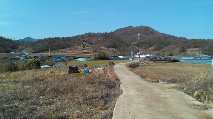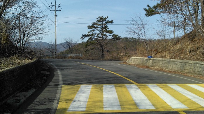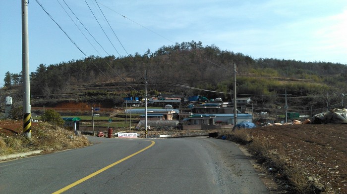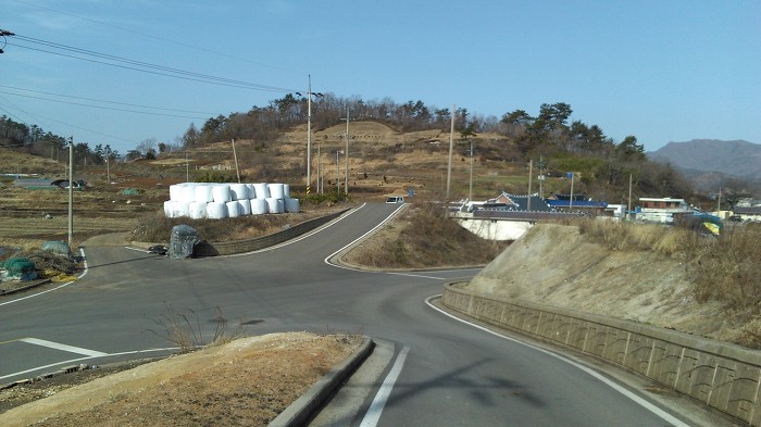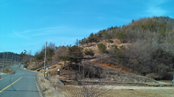 (10:25) 왔던 길을 따르다가 2분 뒤 능선 산판 농로로 나아가니 결국 도로와 만난다. 이어 능선으로 진입해 보았으나 밭과 무덤을 지나 덤불 탓에 진행이 불가능하다. 할 수 없이 왼편 도로로 내려서니 노인분과 다시 마주쳐 작별인사를 나누었다.
