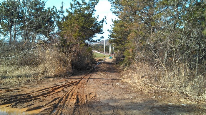 (11:20) 오른쪽으로 도로를 따라 내려서다가 삼거리에서 왼쪽으로 나아가다 왼쪽으로 보이는 산판길로 올라섰다. 능선에 이르니 묘지 또는 밭 관리용 막사인 듯한 컨테이너가 있는데, 오른쪽으로 내려서서 밭을 가로질러 산판 농로를 만났다. 이어 산판 농로를 버리고 오른편 능선으로 나아가니 능선 왼편으로 소로가 이어지는데, 왼편에서 다시 산판 농로를 만나 도로에 닿았다.