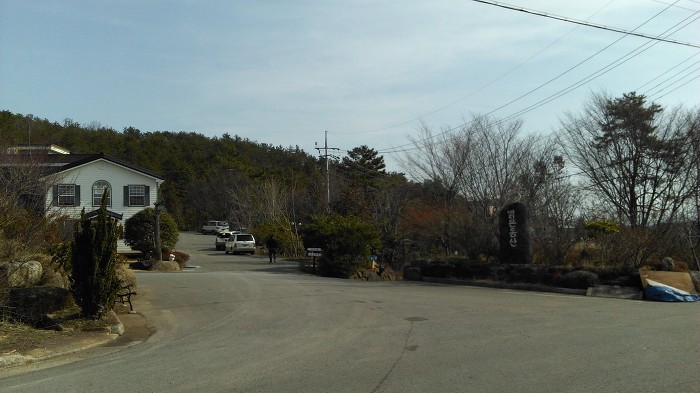 (11:54) 그 쪽으로 들어서니 길이 동쪽으로 휘길래 오른편(남남동쪽)으로 보이는 산판길로 들어서니 길은 서쪽으로 휘어 능선상의 밭에 닿는다. 왼쪽(남쪽)으로 흐릿한 족적을 따라 잡목을 헤치며 오르다가 분맥이 아님을 깨닫고 되돌아 다시 밭에 내려섰다. 가시덤불을 뚫고 무덤에 이르니 오른편에서 산판길을 만났고, 대략 서쪽으로 나아가 무덤 두 개가 있는 언덕에 닿으니 길은 없다. 덤불을 뚫고 2분 뒤 왼편에서 길 흔적을 만났고, 너른 터에 무덤이 자리한 두리봉에 이르렀으나 아무런 표식이 없다. 분맥은 북서쪽이나 덤불이 무성하기에 LG기지국에서 남쪽으로 내려서니 묘원이 나오고 북서쪽으로 나아가 안부에 닿았다. 어차피 분맥을 벗어났기에 남쪽으로 내려섰고, 요양원(‘밝은동산’) 건물을 지나 도로에 이르니 ‘작은자의집·밝은동산’ 표석이 있고, 오른쪽으로 나아가 삼거리(‘쟁갈재’?)에 이르니 오른편에 ‘長岩里’ 표석이 세워져 있다.