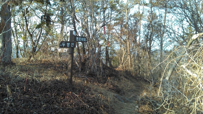 (15:56) 동쪽으로 시야가 트이는 정상에 이르니 갈림길인데, ‘↑용흥사 1.4km, →두방산 1.82km, ↓비조암 0.82km’ 이정목과 망가진 ‘고흥 병풍산 ??2m’ 표시목이 있다. 오른쪽으로 나아가 바윗길을 내려서서 갈림길에 이르니 ‘←두방산, →비조암(노약자), ↓병풍바위·비조암’ 표시목이 있다. 그러니까 정상 직전의 갈림길은 우회로인 것이다. 암봉을 오른편으로 비끼니 순한 길이 이어졌고, 갈림길에 이르니 ‘↑두방산, →봉두산, ↓병풍바위’ 표시목이 있다. 오른쪽(서쪽)으로 나아가니 길 흔적은 다소 흐릿해지는데, 언덕에 이르니 오른편에서 철탑 건설용인 듯한 산판 갈림길이 합류하였고, 왼편으로는 철탑이 보였다. 이어 왼쪽으로 산판 갈림길이 보였으나 서북쪽으로 직진하니 길 흔적이 다소 흐릿하다가 이내 뚜렷해진다.