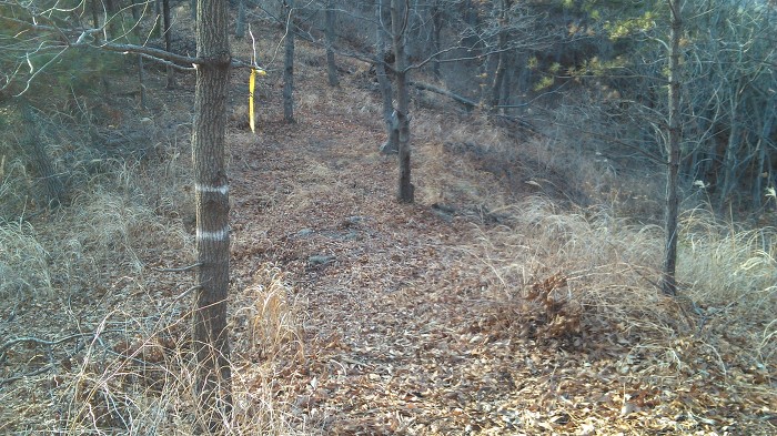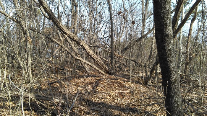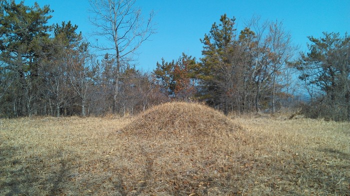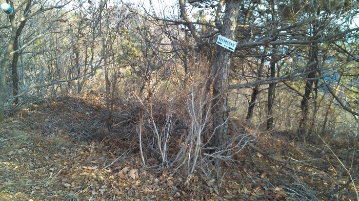(13:54) 다시 출발하여 묘지를 지나 덤불 사이로 길 흔적이 이어졌고, 빨간색 표지기도 꾸준히 눈에 띄었다. 15분여 뒤 쌍묘에 닿아 왼쪽(남서쪽) 길 흔적을 따라 2분여 나아가 보니 방치된 산불초소가 있다. 되돌아서 다시 쌍묘에 닿았고, 북북서쪽으로 나아가니 길 흔적은 이어진다.