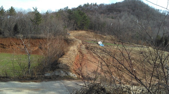 (11:32) ‘天安全氏世葬山’ 표석에서 사면을 치고 오르니 이내 오른편에서 시멘트길을 만나는데, 묘지에 이르니 길은 끊어진다. 북서쪽 사면을 치고 올라가니 족적이 보이기도 하였다. 잡목을 치고 나아가 언덕(×115.6m)에 이르렀으나 아무런 표식이 없다. 성가신 덤불을 뚫고 7분여 뒤 폐묘를 지났고, 조금 뒤 오른편에서 묘지서 온 길을 만났다. 도로에 내려서서 보니 정면에는 농장이 자리하기에 왼쪽으로 몇 걸음 나아가니 남쪽으로 시멘트길이 보였다.