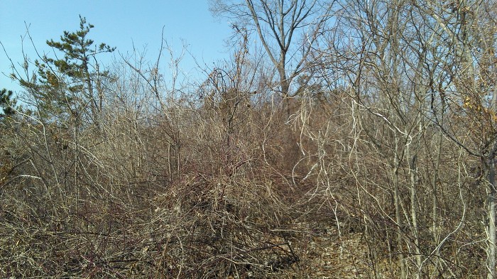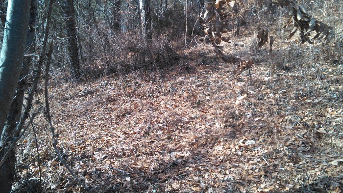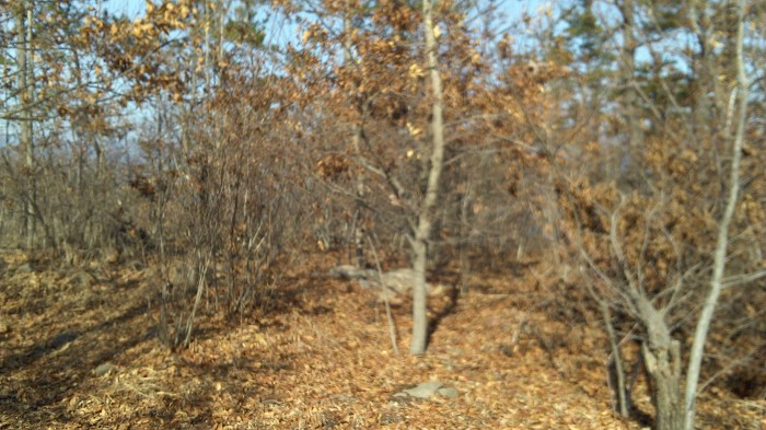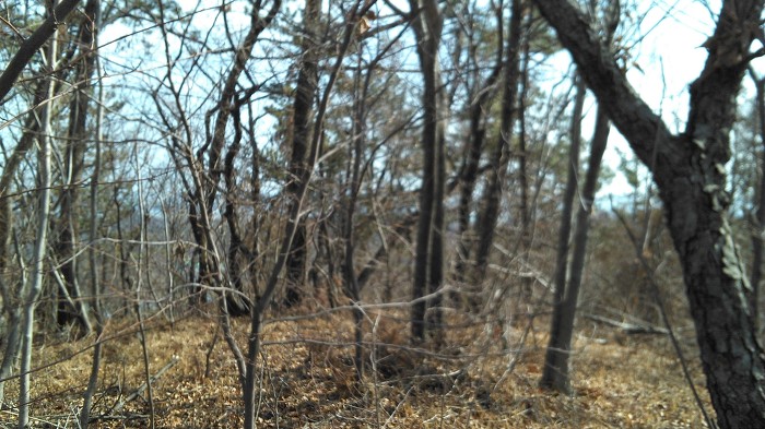 (10:44) 사거리에 닿아 직진하였다가 왼편 구릉성 능선의 밭으로 붙었다. 묘지에서 북북서쪽으로 나아가니 능선은 덤불이 빼곡하여 묘지 가장자리를 따라 시멘트 농로에 닿았다. 조금 뒤 갈림길인데, 왼편으로 나아가니 산판 농로가 능선 왼편으로 이어졌다. 조금 뒤 산판 농로를 벗어나 오른편 소로로 들어서서 1분 뒤 능선에 닿으니 다시 산판 농로를 만나고 이를 가로질러 무덤에 이르니 흐릿한 족적이 잡목 덤불 사이로 이어진다.
