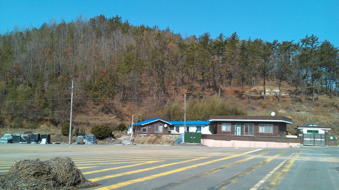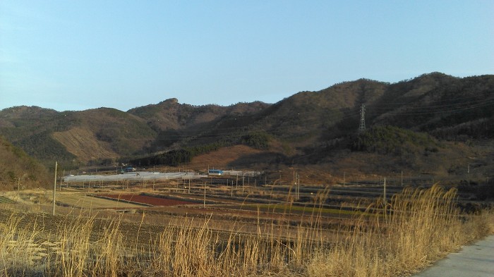 (11:00) 언덕(봉황산)에 이르니 잡목이 빼곡하여 조망은 없다. 되돌아서 다시 산판 농로에 닿았고, 비탈밭을 가로지르며 덤불 능선을 피하여 나아가다 시멘트 농로를 가로지르니 덤불이 빼곡하다. 덤불 사이 족적을 만났고, 왼편에 밭이 보이면서 능선 왼편으로 산판길이 이어졌다. 시멘트 농로에 닿아 왼편으로 몇 걸음 가니 오른쪽(남쪽)으로 산판 농로가 보여 그 쪽으로 들어섰다. 조금 뒤 오른편 능선으로 붙으니 길이 이어지는데, 묘지에 이르니 길은 거의 사라진다. 이내 도로에 내려서니 왼편에는 ‘상장’ 정류소가 있고, 맞은편에 있는 민가에서는 개가 짖어대며 진입을 못하게 한다.