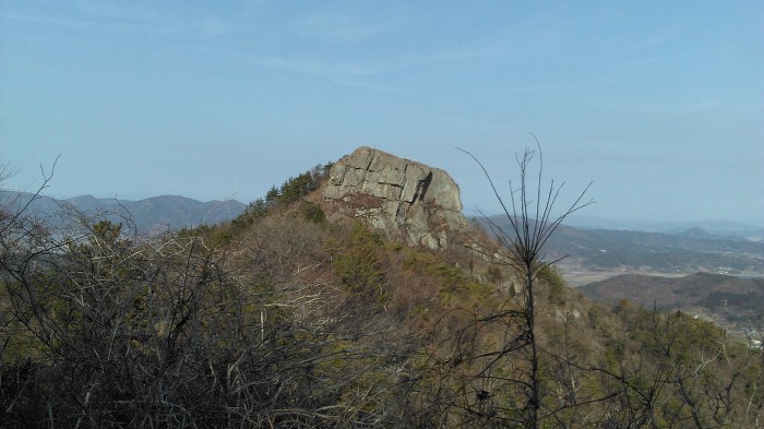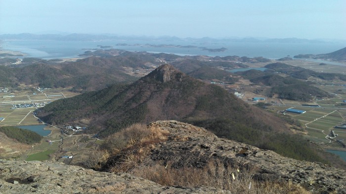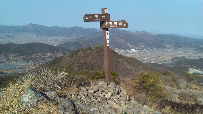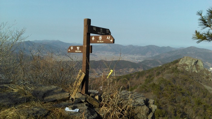 (15:38) 바위봉 정상에 서니 ‘비조암, ←두방산 2.8km, ↓운동마을 1.15km’ 이정목이 있는데, 사방으로 시야가 트여 호남정맥의 가지산, 존제산, 백이산·조계산과 제석산, 첨산, 병풍산 등이 바라보인다. 바윗길을 내려서서 12분여 뒤 정상 밑의 갈림길에 이르니 ‘↖병풍바위·두방산, ↓비조암’ 표시목이 있다. 왼쪽으로 오르니 정상까지 바윗길이 잠시 이어진다.