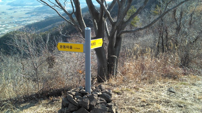 (15:00) 안부에 이르니 오른편에서 뚜렷한 길이 합류하였고, 무덤에 이어 뚜렷한 길을 벗어나니 이내 오른편에서 너른 등산로를 만났다. 쌍묘 왼편으로 정비된 산길이 이어졌고, 7분여 뒤 두 돌탑 사이를 지났다. 바위봉을 왼편으로 비껴 8분여 뒤 왼쪽으로 갈림길이 보였는데, ‘←운동마을 1.0km, ↑비조암 0.15km’ 이정목이 있다. 막바지 바윗길을 거치니 왼쪽 지릉으로 내리막 갈림길이 보였는데, ‘←첨산 2.3km, ↓운동’ 이정표가 있다.