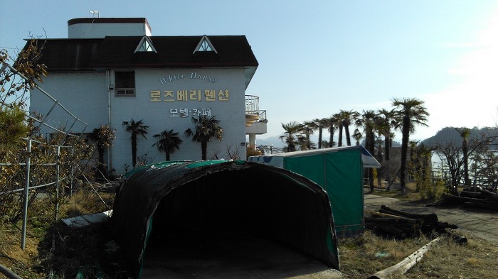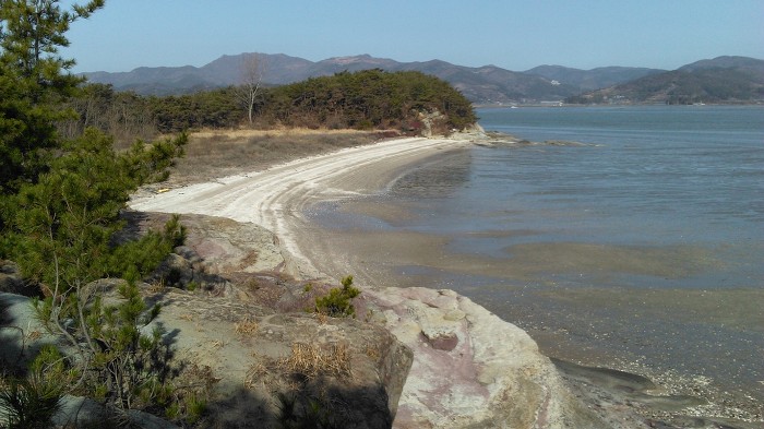 (10:02) 남쪽으로 나아가 이른 사거리에서 왼쪽(동남쪽) 길로 들어서니 포장길은 거의 구릉성 능선을 따라 이어진다. 15분여 뒤 오른편에 목제데크 길이 보였는데, ‘보성벌교갯벌습지보호지역’ 안내문이 있다. 왼편에서 능선 산판길을 만났고, 2분 뒤 ‘로즈베리펜션’에 이르니 길은 끝난다. 왼편으로 내려서니 바위벽 밑으로 활 모양의 해변이 내려다보였는데, 되돌아나오니 펜션 주인이 어떻게 왔느냐고 묻는다.