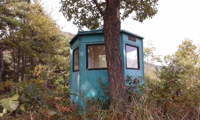 (11:33) ‘임산물불법채취특별단속’ 플래카드 뒤편으로 오르니 잡목 사이로 산길이 이어졌고, 절개지 위를 거쳐 능선에 이르니 덤불 사이로 산길이 보인다. 이내 간벌된 잡목이 성가신데, 언덕에 이르니 산불감시초소에는 ‘國旗山 530m 3425번째 한현우 12년7월5일’로 적힌 표지기가 걸려 있다. 간식을 먹을 겸 9분여 쉬다가 다시 출발하니 여전히 간벌잡목이 성가셨고, 안부를 지나니 가파른 오르막이 이어진다.