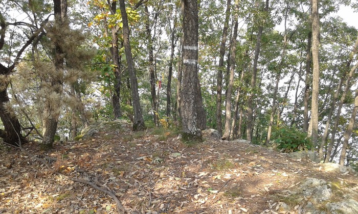 (13:48) 헬기장이 설치된 조항산 정상에 이르니 왼편에는 ‘↑율소 2.2km, ↓공원묘원 0.8km’ 이정목, ‘전일상호신용금고, ←조항 2.0km, →분주동 1.1km’ 이정표와 함께 산길이 보였고, 오른편에는 안내판에 ‘무주 301, 800.3m’로 표시된 묵은 삼각점이 놓여 있다. 삼각점에서 동쪽으로 내려서니 길 흔적은 양호한데, 12분여 뒤 언덕을 지나니 길 흔적은 다소 흐릿해지고 용도를 알 수 없는 고무호스(?)가 잠깐 이어지면서 옛적의 묵밭도 보인다. 노고산 전의 안부를 지나니 경사가 가팔라지는데, 낮은 언덕을 지나서 막바지 오르막을 통과하니 허물어진 석축이 보였고, 이어 정상에 도착하였다.