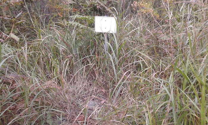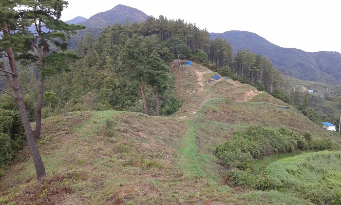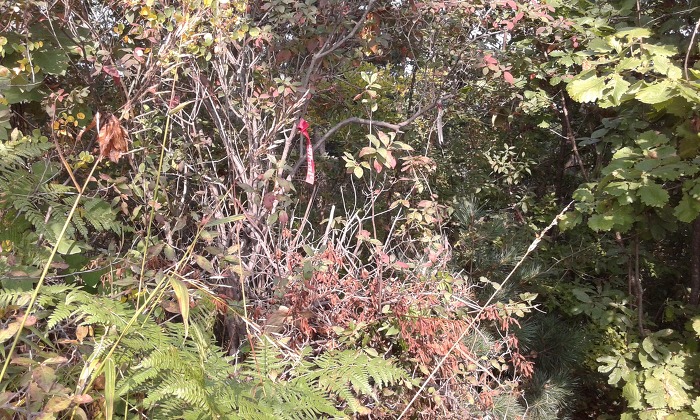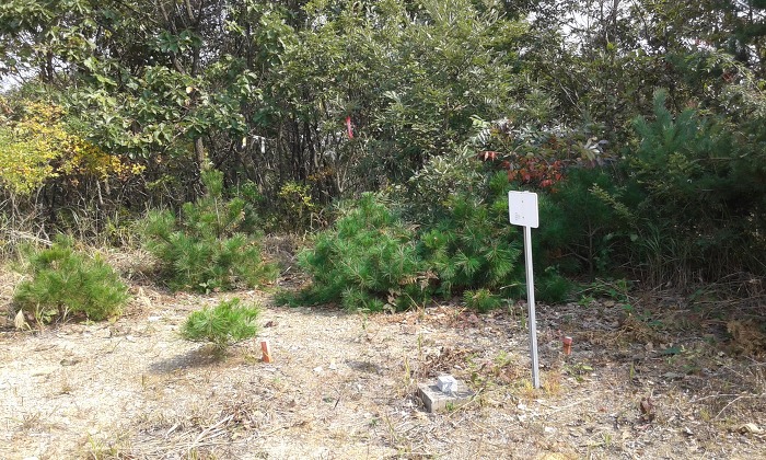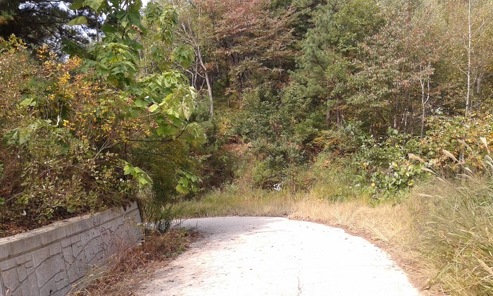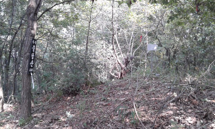(10:18) 분기점 언덕에 이르니 표지기가 두어 개 보이는데, 한숨 돌리고 다시 출발하여 북서쪽으로 내려서니 잡목덤불 사이로 흐릿한 산길이 보이다가 4분여 뒤 언덕을 지나니 길 흔적은 사라지고 잡목덤불이 성가셨다. 내려서다 보니 분맥을 오른편으로 벗어나 있으나 그냥 진행하여 무덤 터를 지나니 잡목덤불 사이로 족적이 보이면서 임도에 내려섰다. 왼쪽(남남서쪽)으로 나아가 2분여 뒤 분맥능선에 이르고, 능선으로 들어서니 흐릿한 산길이 이어지다 길 상태가 다소 양호해진다. 언덕을 지나니 다시 잡목덤불이 짙어졌으나 능선 왼편에서 산길을 만난 데 이어 안부를 지났다. 다음 언덕에서 북쪽으로 내려서니 길 흔적은 보이지 않다가 오른편에서 풀숲길을 만나고 이어 가옥이 자리한 ‘저수골재’에 닿았다.