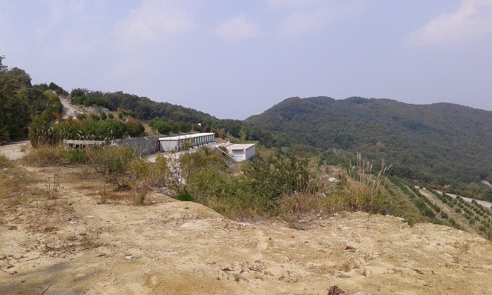 (11:06) 정상에 이르니 안내판에 ‘무주 435, 628.1m’로 표시된 묵은 ‘1989 재설’ 삼각점과 함께 ‘무주 불당산 626m’ 표시목이 걸려 있다. 북북동쪽으로 잡목 사이를 내려서니 이내 흐릿한 산길이 보였고, 10분여 뒤 벌목지에 이르니 앞쪽으로 구왕산이 바라보인다. 어차피 도로의 절개지에 닿을 것이므로 안부에서 오른편 풀숲길로 내려서서 간이막사를 지나 도로에 이르렀고, 왼쪽으로 몇 걸음 오르니 ‘고노치’ 정상이다.