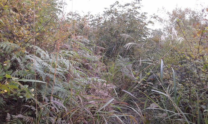 (10:51) 너른 길이 이어지다 밭에 이르니 길은 끝나는데, 밭 왼편 덤불을 헤치며 나아가 풀숲길에 들어섰다. 너른 길이 끝나면서 흐릿한 산길이 이어지는데, 오르막에 들어서니 왼편 무덤으로 이어지는 갈림길이 보인다.