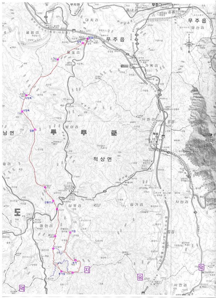 조항분맥은 덕유지맥상 봉화산과 국사봉 사이 약 700m봉 분기점에서 불당산, 구왕산, 조항산, 노고산을 거쳐 삼유천이 금강에 합수하는 지점까지 도상 약 14.6km의 산줄기이다. 예전에 국기산에서 조항산을 거쳐 노고산까지 종주한 바 있고, 불당산은 저수골재에서 오른 바가 있어 조항분맥 중 남은 부분은 분기점에서 저수골재까지이나 오래 전의 일이라 다시 분기점에서 종주해보기로 하였다. 7시 30분경 집을 출발, 금산을 거쳐 무주군 무주읍 용포리 삼거리에는 8시 43분경 도착하였다. ‘금강수퍼’ 앞에서 8시 48분경(무주터미널에서는 08:40發) 도착한 삼유리行 버스를 타니 ‘내동’과 ‘도류’마을을 들렀다가 중유 이후의 도로공사 때문에 ‘상유’종점 못 미친 ‘중유’에 9시 17분경 도착한다.