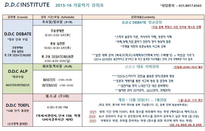 ★2015-16 D.D.C INSTITUTE 겨울방학 특강 강좌표☆ 작성자D.D.C. INSTITUTE|작성시간15.12.04|조회수646 목록 댓글 0 글자크기 작게가 글자크기 크게가 다음검색 현재 게시글 추가 기능 열기 북마크 공유하기 신고 센터로 신고 댓글 댓글 0 댓글쓰기 답글쓰기 댓글 리스트